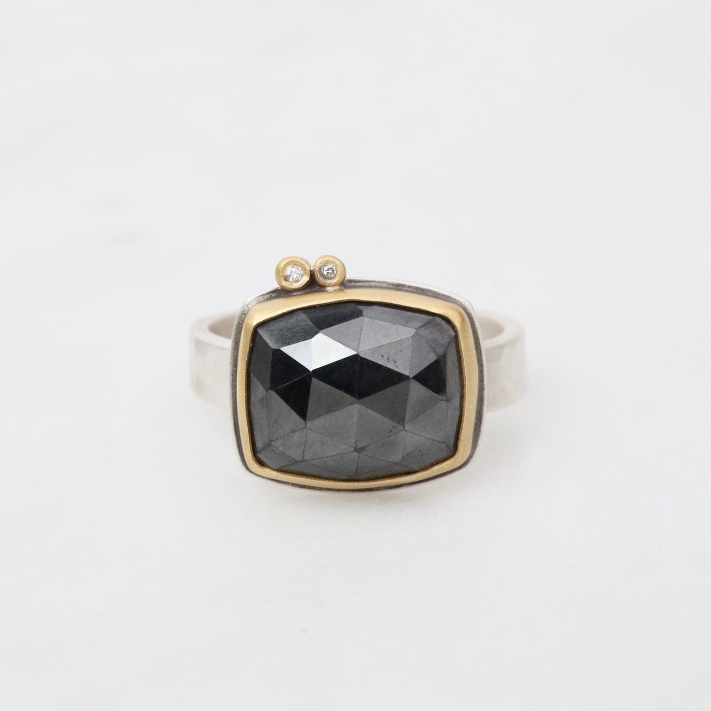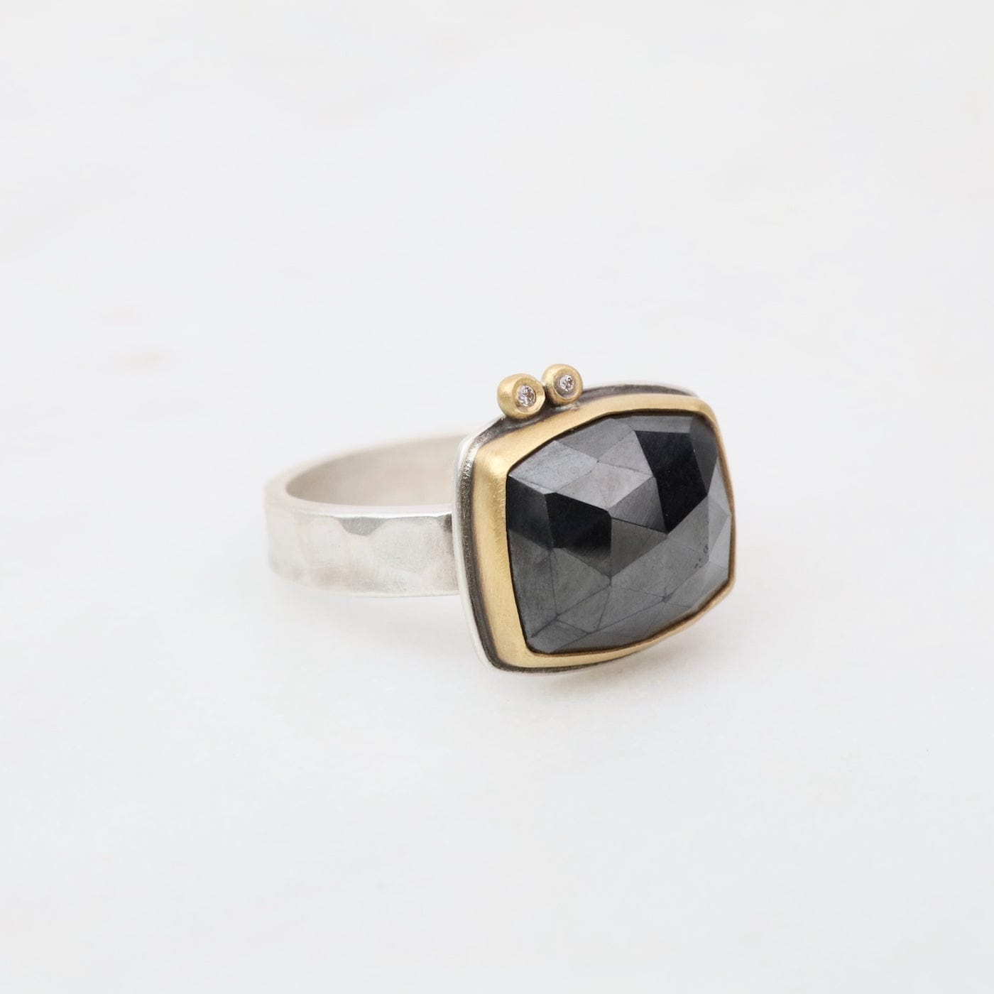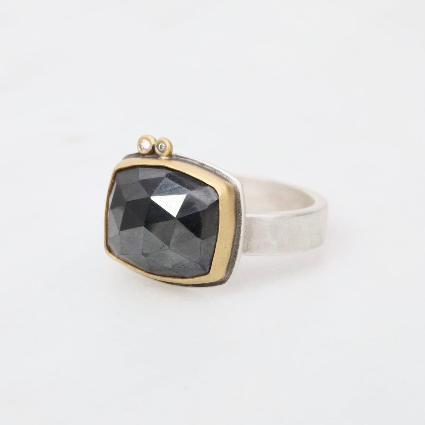 A rosecut sparkling hematite is wrapped in warm 22k gold, and accented with a pair of glittering diamonds.