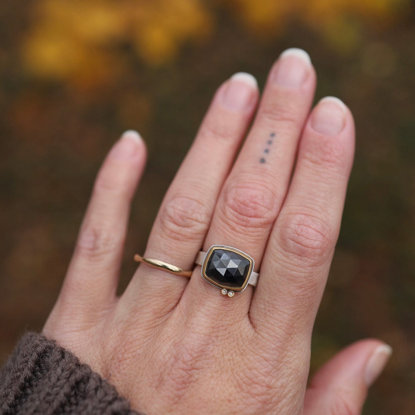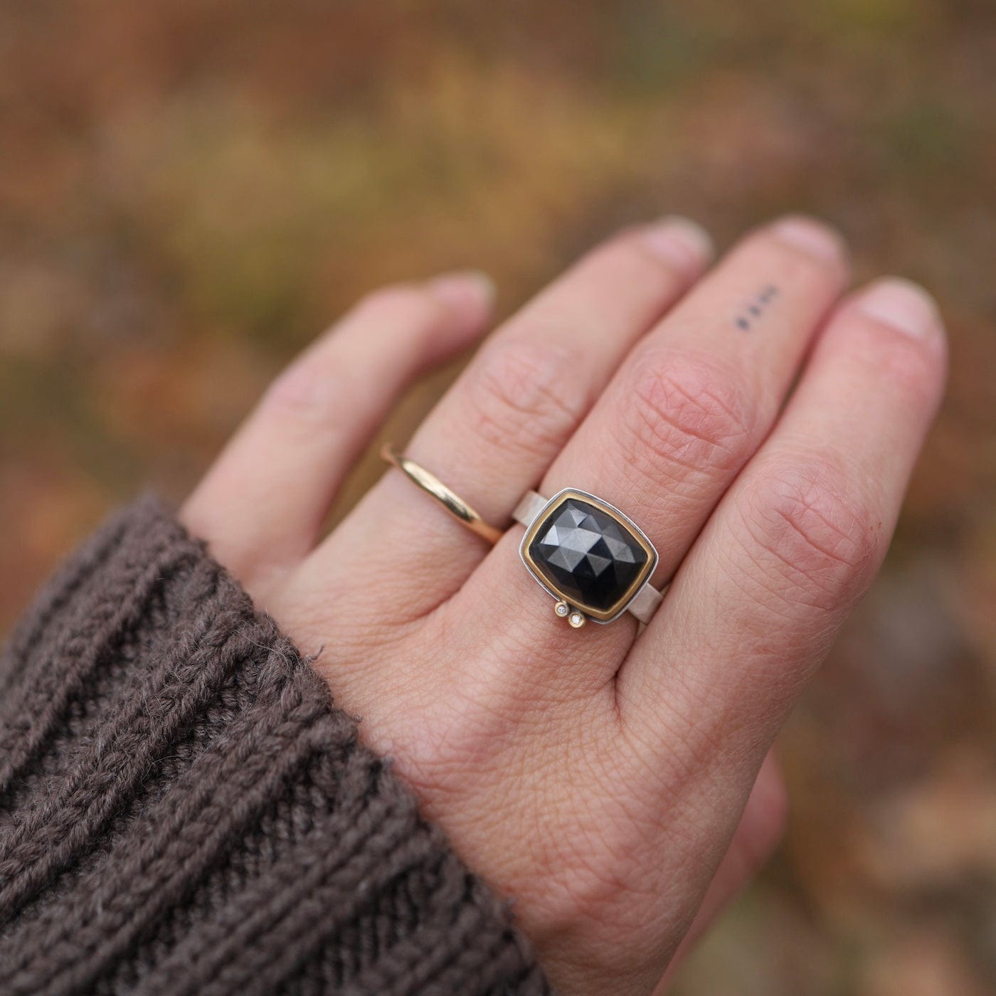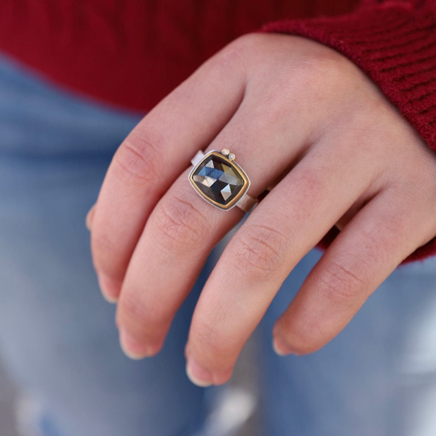 A rosecut sparkling hematite is wrapped in warm 22k gold, and accented with a pair of glittering diamonds.