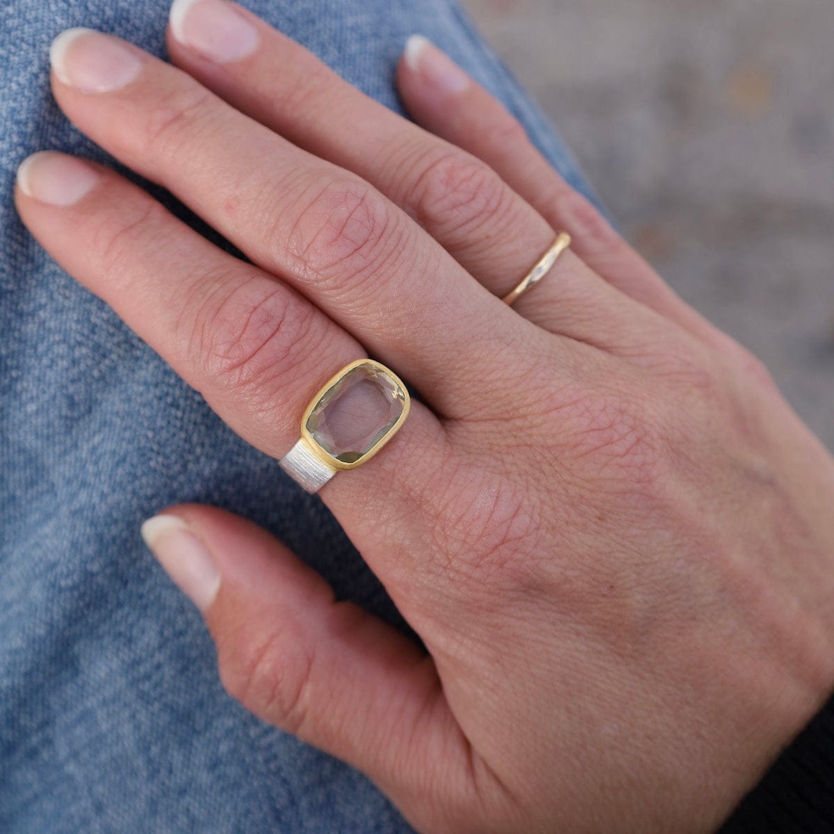 Gold Bezel Green Amethyst Silver Textured Band Ring