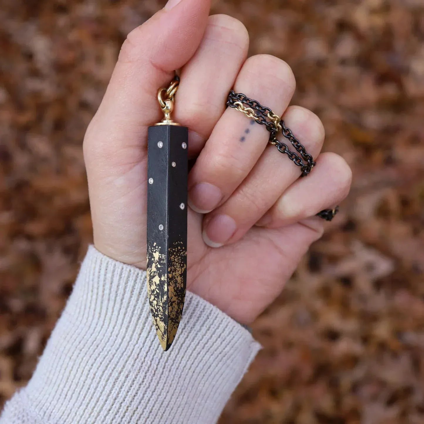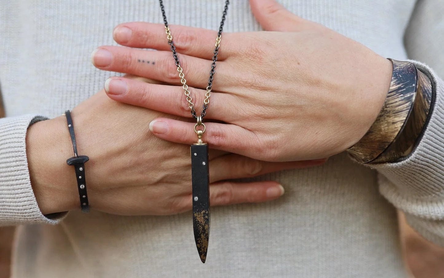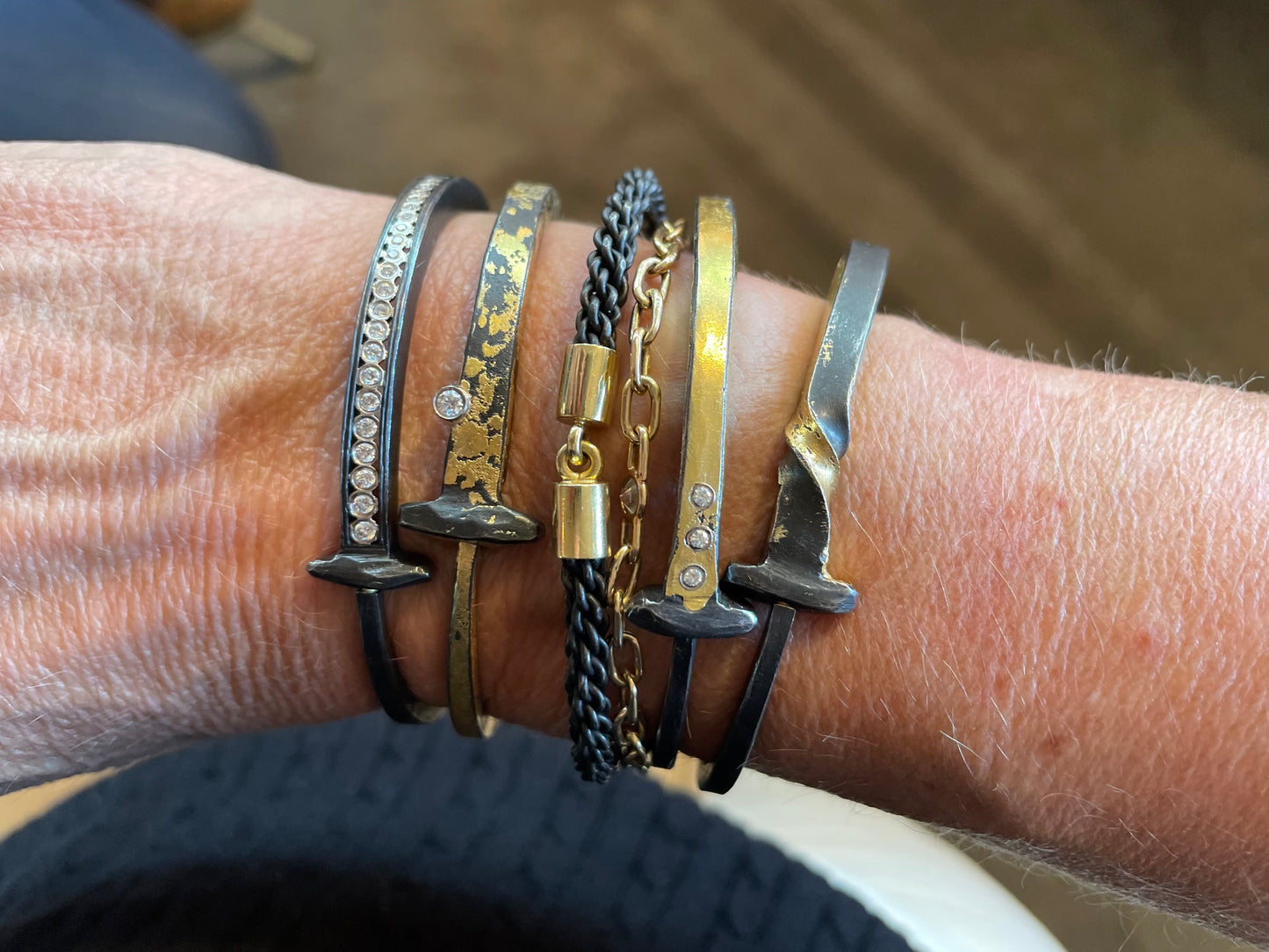 Based in High Falls, New York, Pat Flynn is celebrated for his distinctive nail bracelets and sculptural cuff designs that combine blackened iron with luminous 22k and 18k gold, palladium white gold, diamonds, and pearls. Each piece is entirely hand-forged, often featuring fused 22k gold on iron and finished with exquisitely subtle textures achieved through hammering, engraving, etching, and filing. The result is jewelry of striking contrast, technical mastery, and quiet elegance.