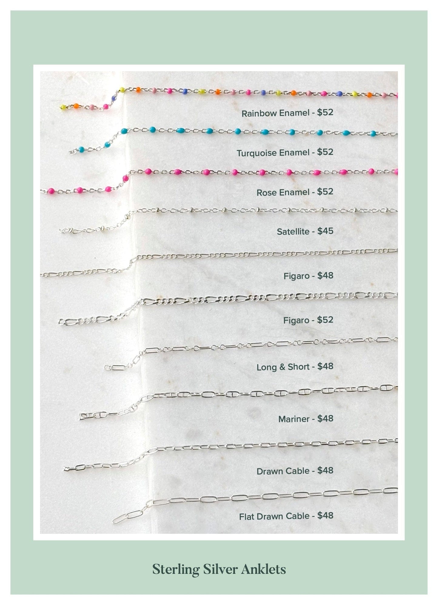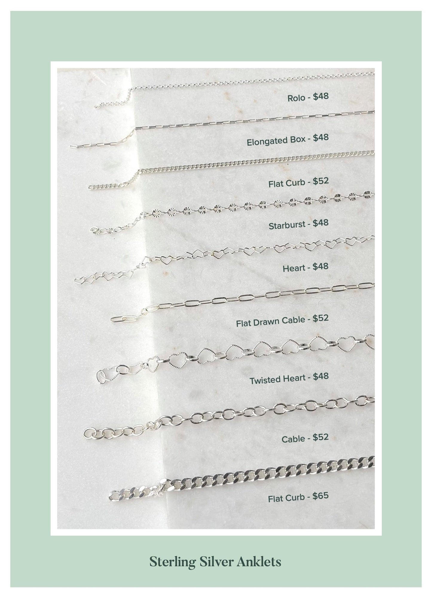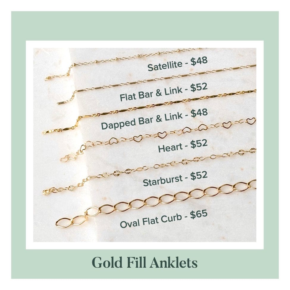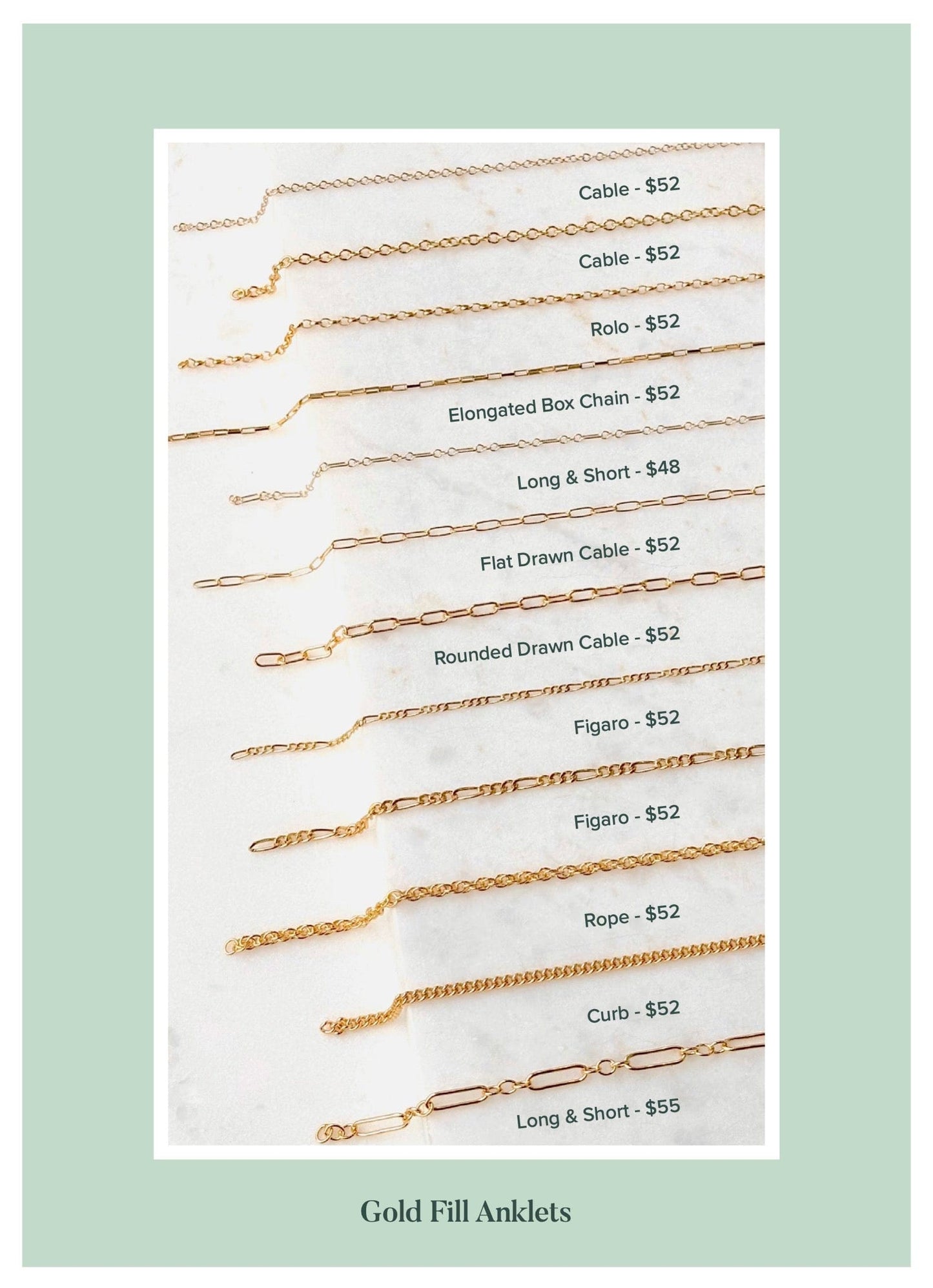 Choose from our wide selection of sterling silver and gold filled chains for your new anklet! From simple and dainty to fancy chains and heavy chains, there is something for everyone.