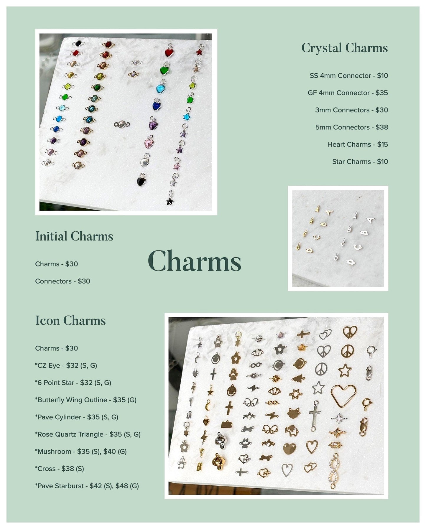 Choose from our wide selection of sterling silver, gold filled, and gold vermeil charms and connectors! Hanging charms are dainty additions that dangle, while connectors are in-line with your chain and are attached in two places. Some styles even have CZs, crystals, and tiny stones! Most of our small charms are $30; you can see specific prices for larger charms below.