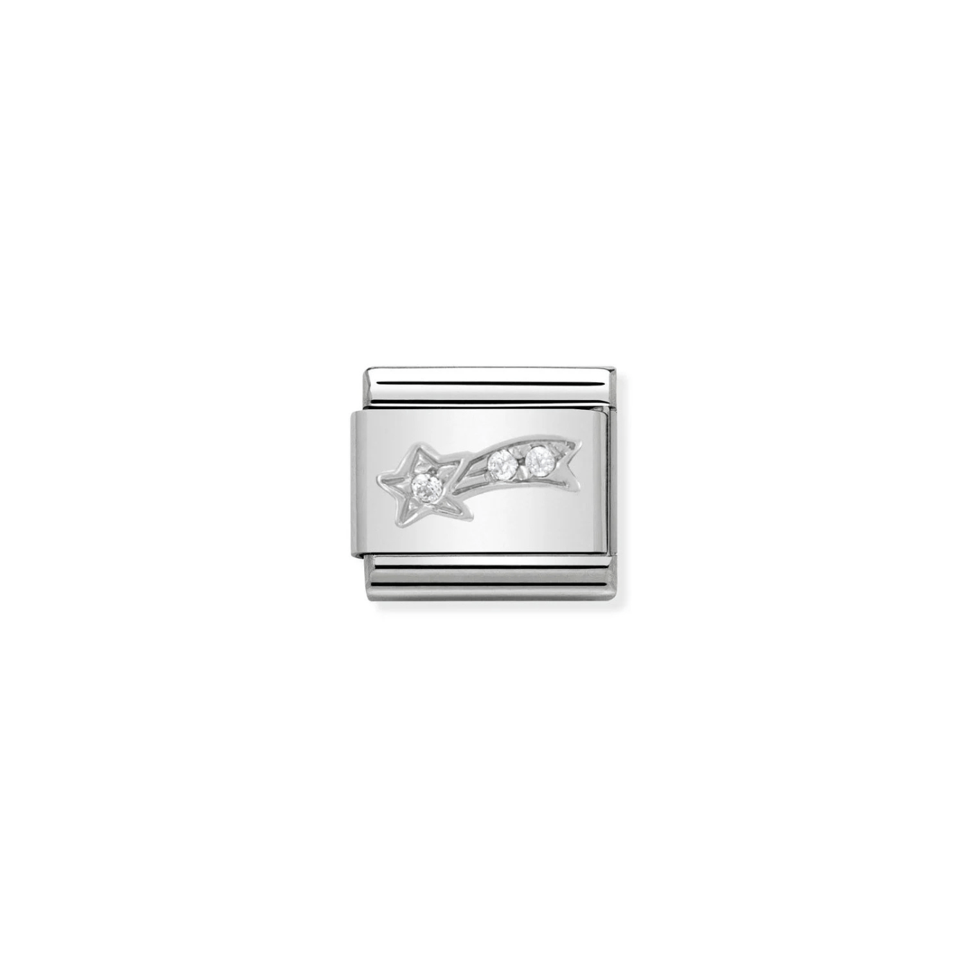 Nomination Original Charm for Classic Composable Bracelet with shooting star / comet symbol in stainless steel, CZ and Silver. The perfect link to signify wishes, magic, or as a decorative celestial element.
