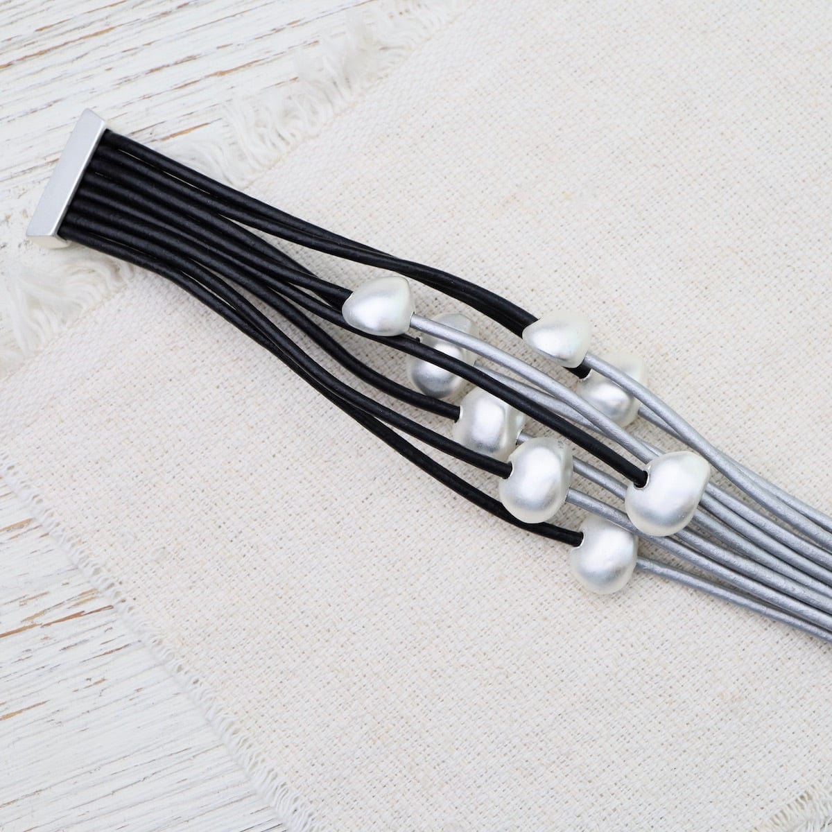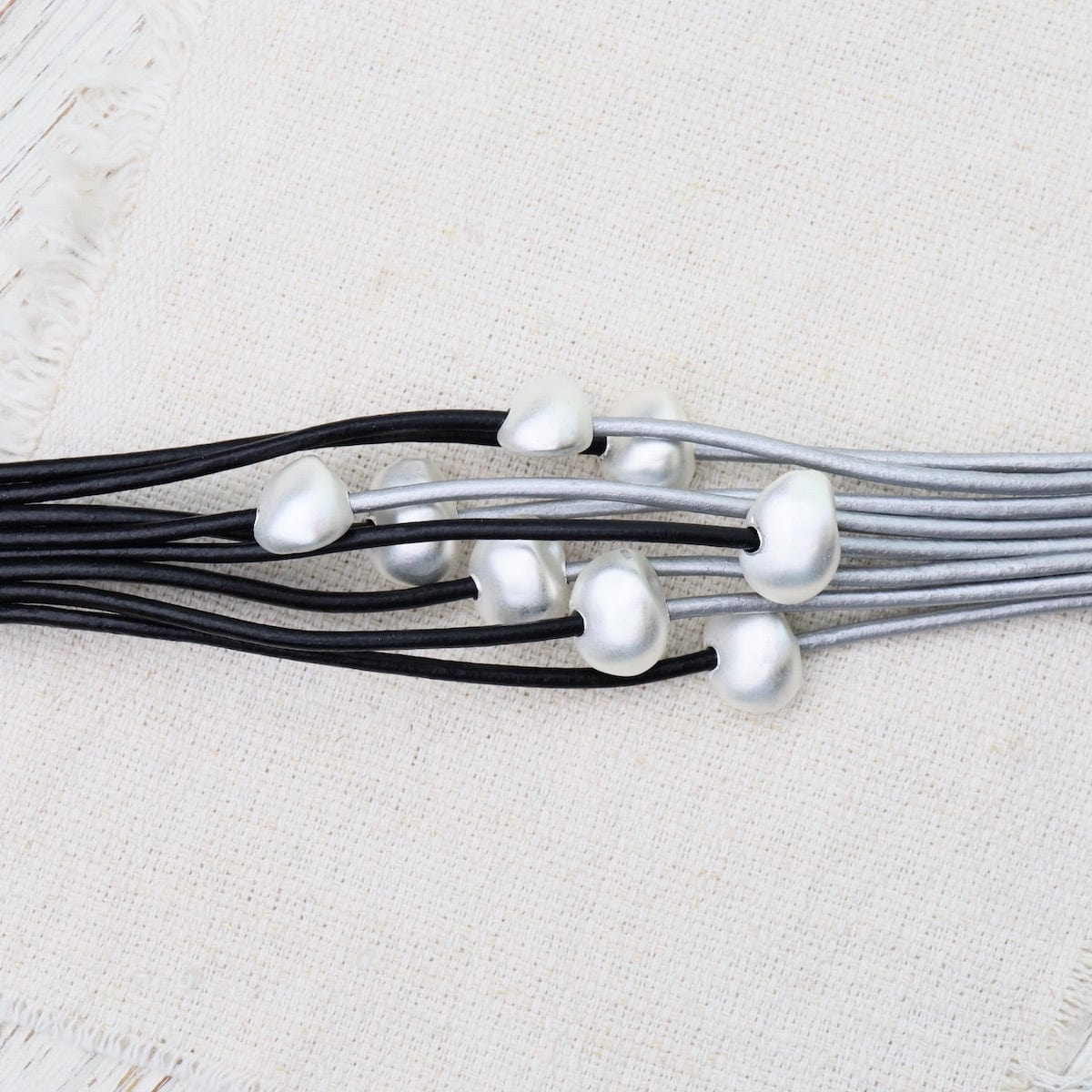 Matte Silver Beads on Black & Grey Leather Bracelet