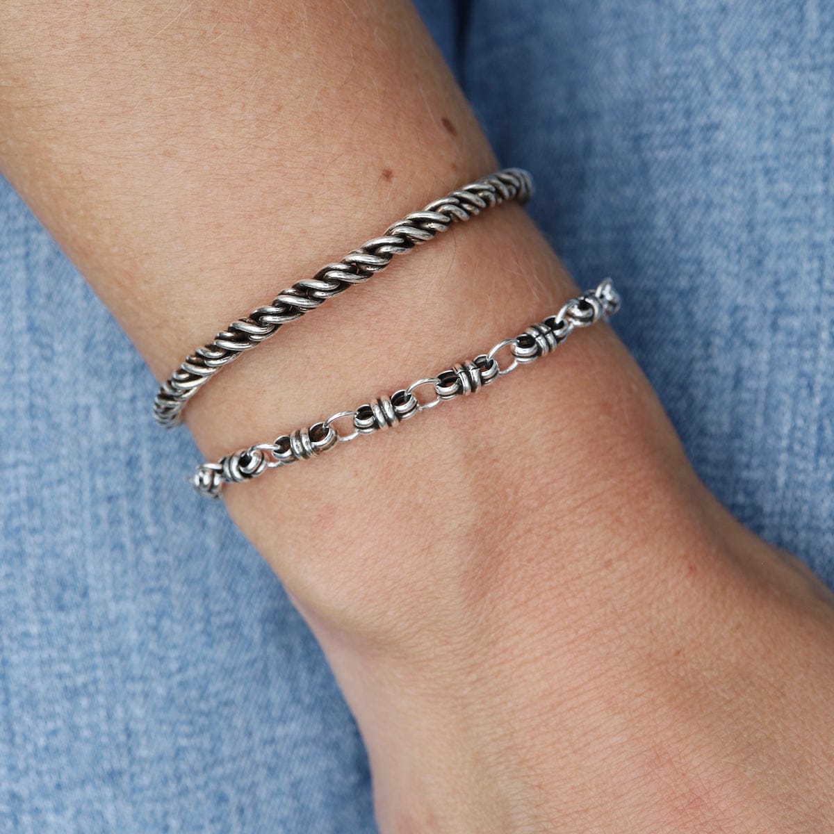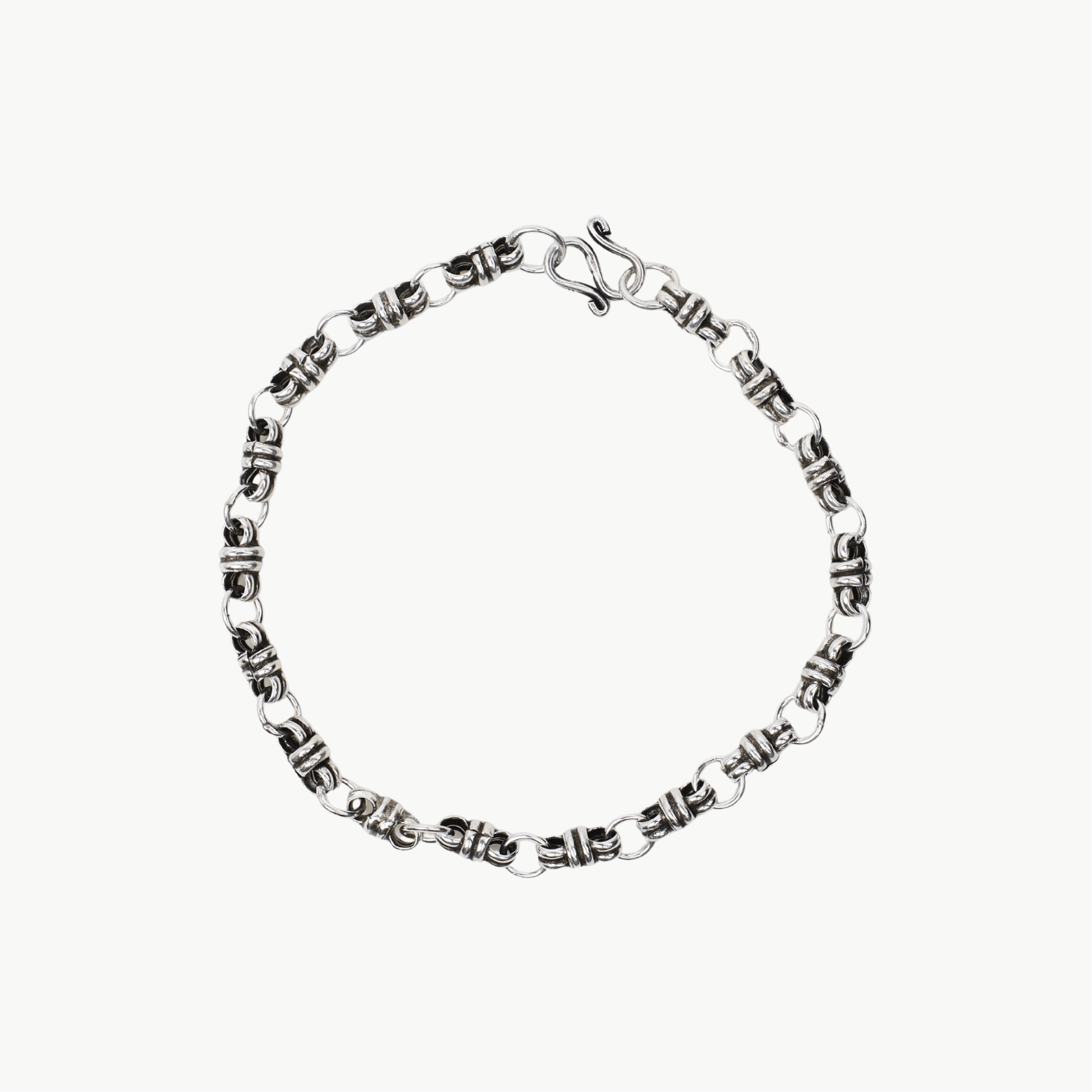 The intricate bound link design adds a unique touch to any outfit, and the oxidized sterling silver gives it a rustic yet elegant look. Perfect for everyday wear or special occasions, this bracelet is sure to make a statement.