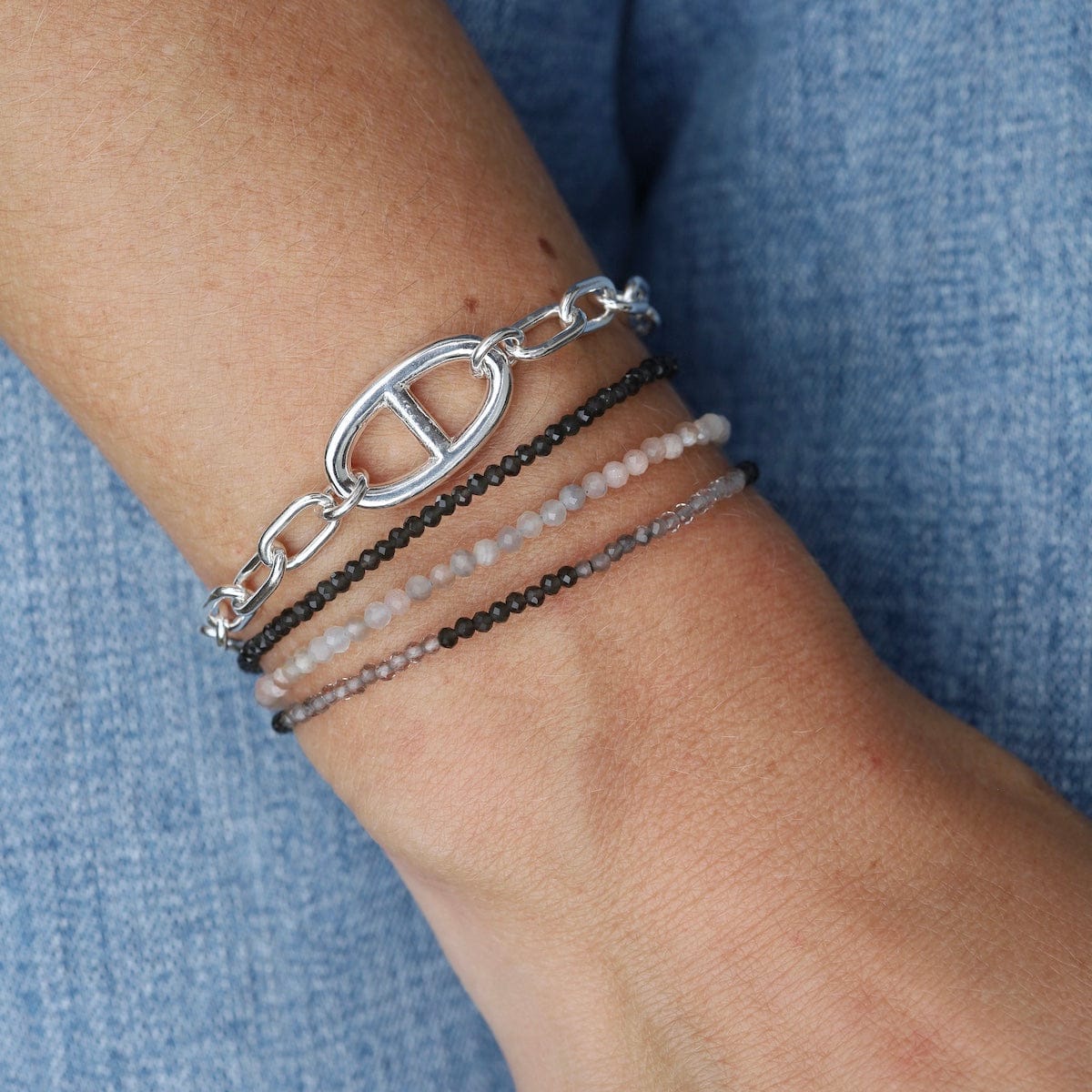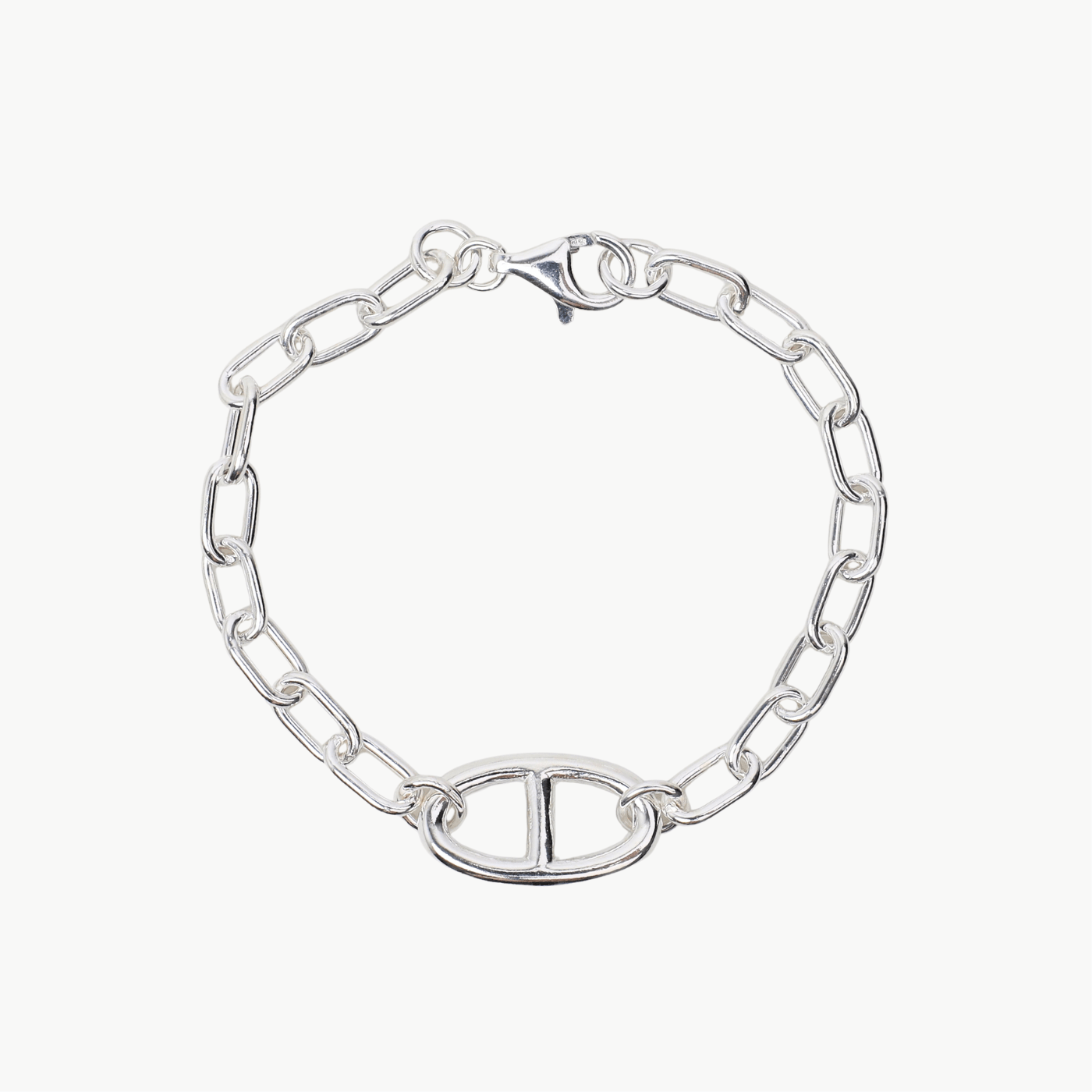 Experience elegance and strength with the Sterling Silver Mid Weight Oval Link bracelet featuring an anchor link center. Crafted with finest quality silver, this bracelet will add a sleek touch to any outfit while reminding you of your resilience and stability. A must-have for any stylish individual.