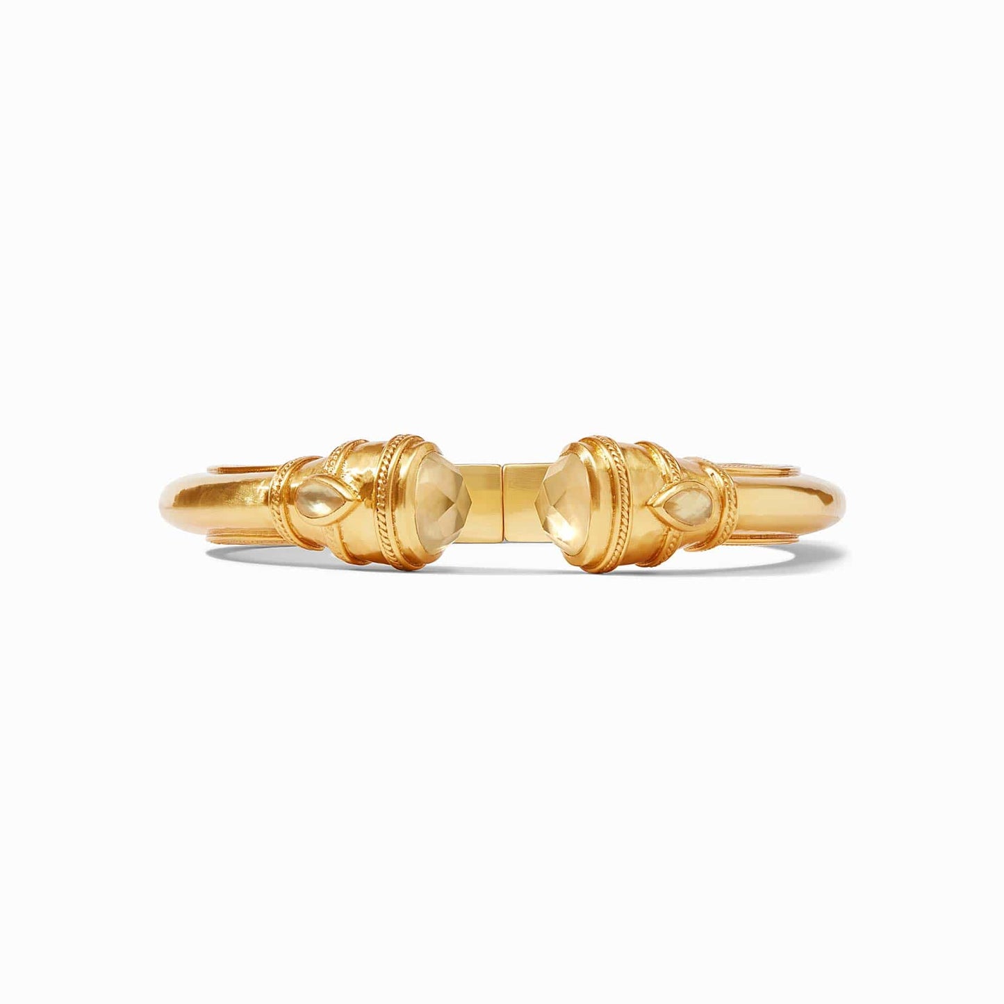Sparkling rose-cut endcaps accented with teardrop gemstones illuminate this gilded cuff with understated elegance. A timeless statement that pairs beautifully with both day and evening looks.