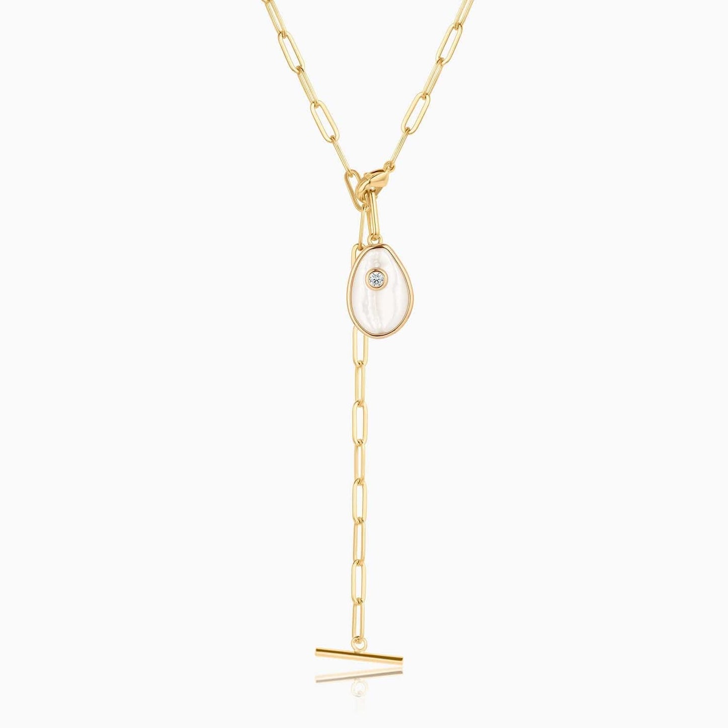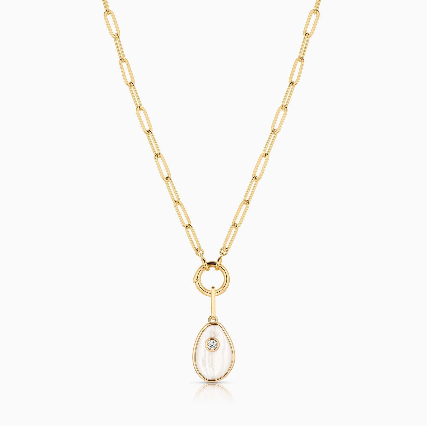 A luminous cowrie-inspired charm that captures the soft glow of mother of pearl, framed in warm 14k gold plating and accented with a single sparkling CZ. A delicate coastal touch perfect for everyday stacking.
