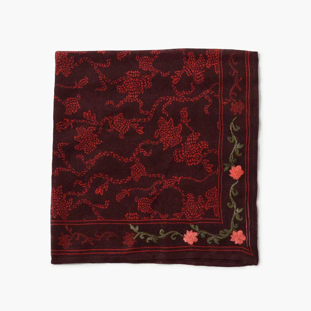 A 100% viscose bandana scarf featuring a kantha floral print and embroidered details along the edge.