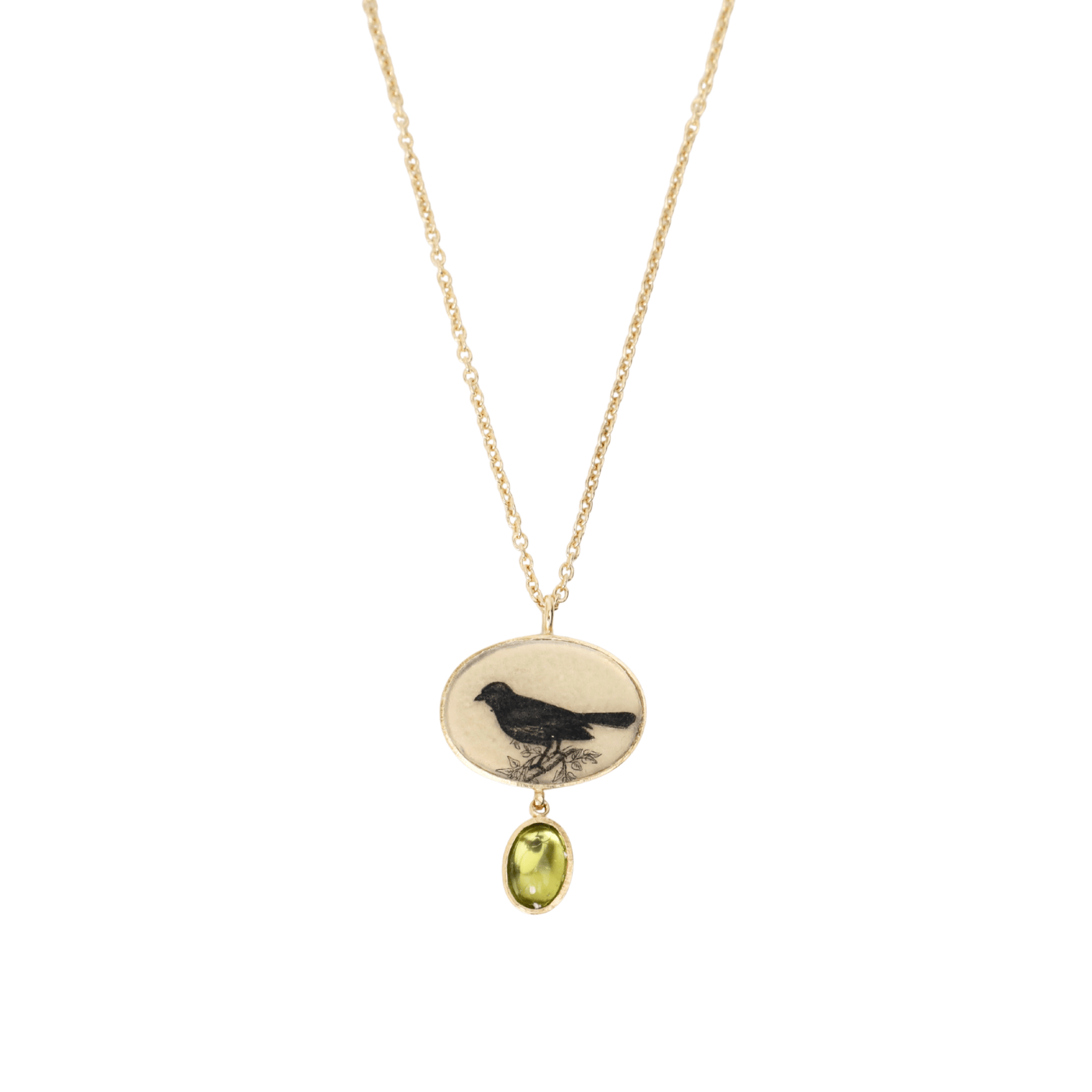 Discover timeless elegance with this pendant necklace, featuring a hand-drawn bird motif symbolizing freedom and family. Finished with a glowing peridot stone.
