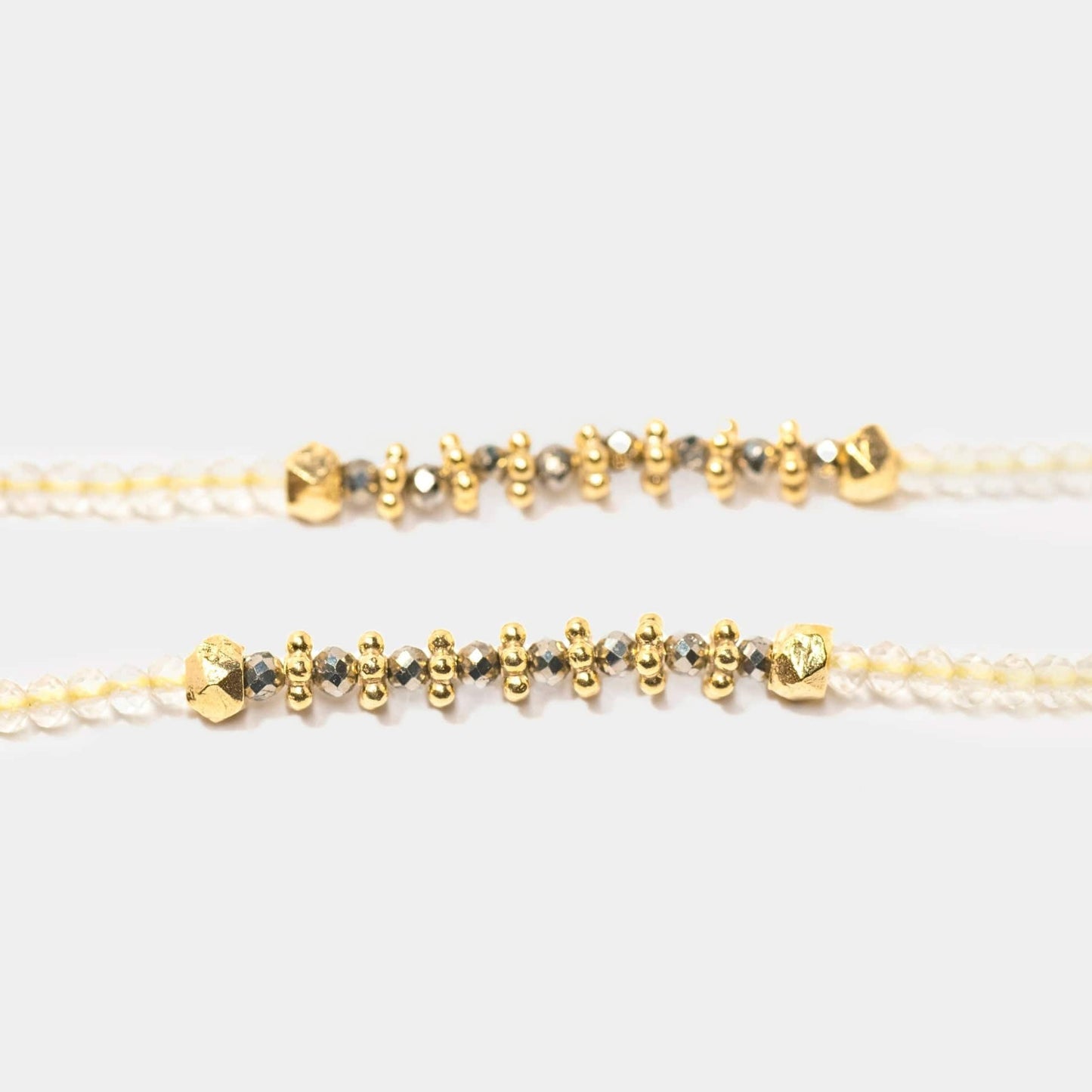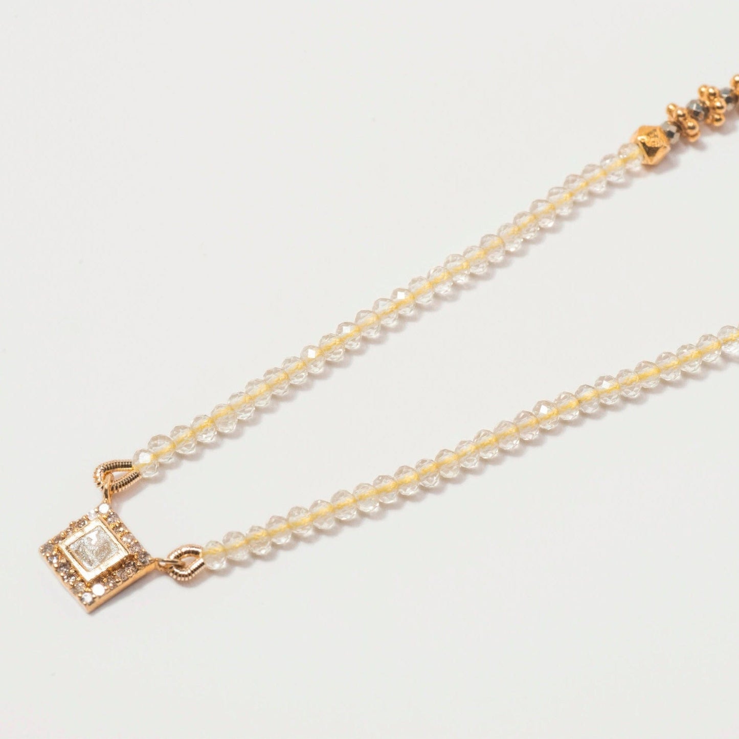 Soft lemon quartz beads glow with gentle radiance, punctuated by rich pyrite for unexpected edge. A square diamond-inlaid pendant brings a refined sparkle—classic lines with a fresh, modern twist. Effortless, elegant, and quietly bold.