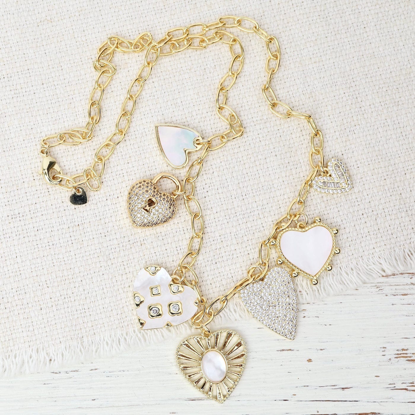 Playful and elegant, this two-tone charm necklace combines gold and silver finishes for a look that’s both modern and timeless. Designed on a paperclip chain, it features an array of beautifully detailed charms—each adorned with shimmering cubic zirconia or luminous mother-of-pearl. A striking statement piece that complements both casual and dressy styles.