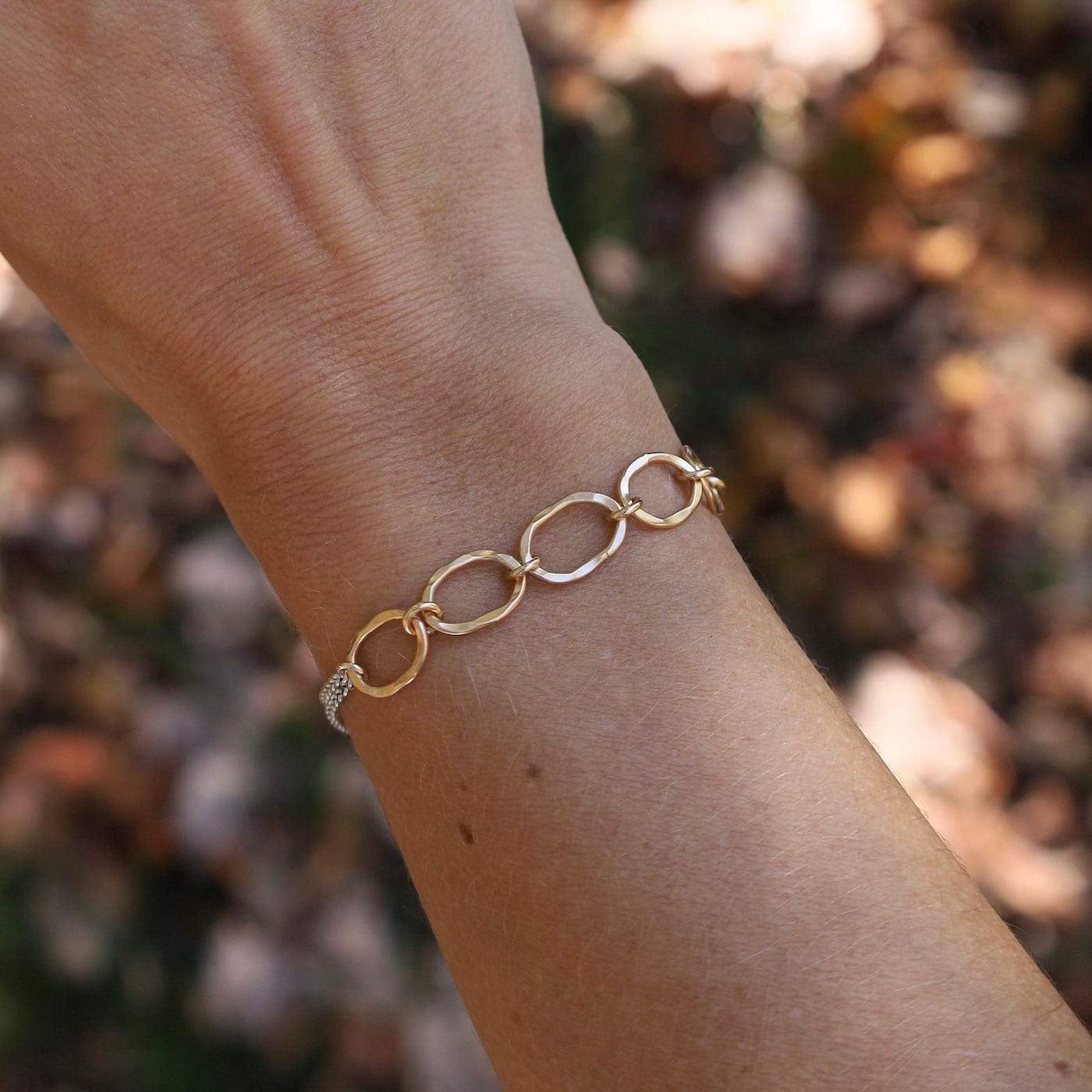 Organic elegance meets modern craftsmanship in this handmade bracelet featuring hand-hammered 14k gold-filled links connected by a delicate sterling silver chain. The contrast of textures and metals makes this piece ideal for layering or wearing solo as a subtle statement. Adjustable for the perfect fit. Handcrafted in Philadelphia, PA.
