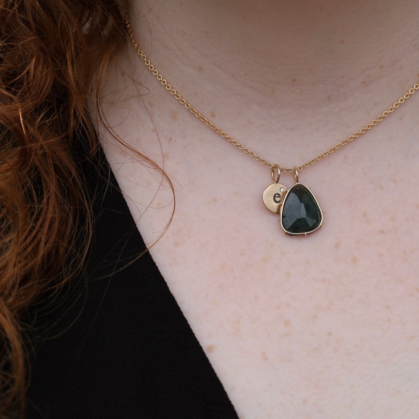 A stunning one-of-a-kind charm featuring a faceted blue-green tourmaline framed in 14k yellow gold. The gemstone’s natural depth and oceanic hues give it a captivating glow, perfect for layering or wearing as a statement centerpiece. Measures 1" in total length and 0.63" wide.