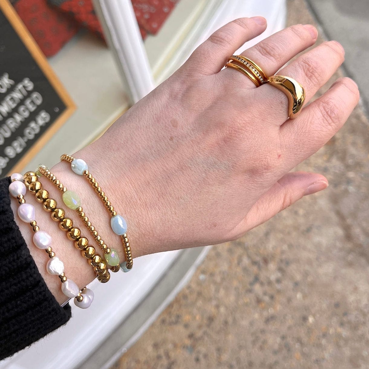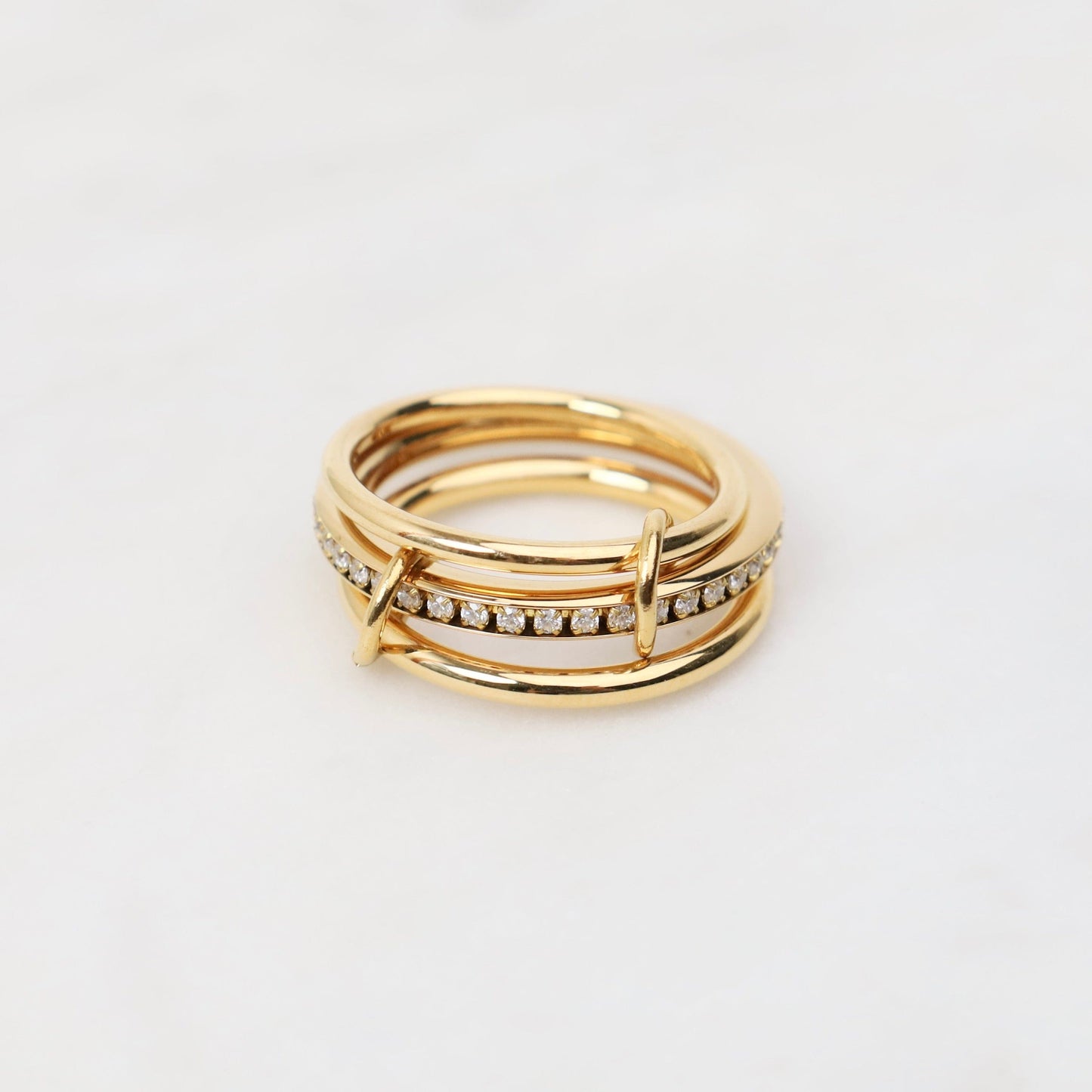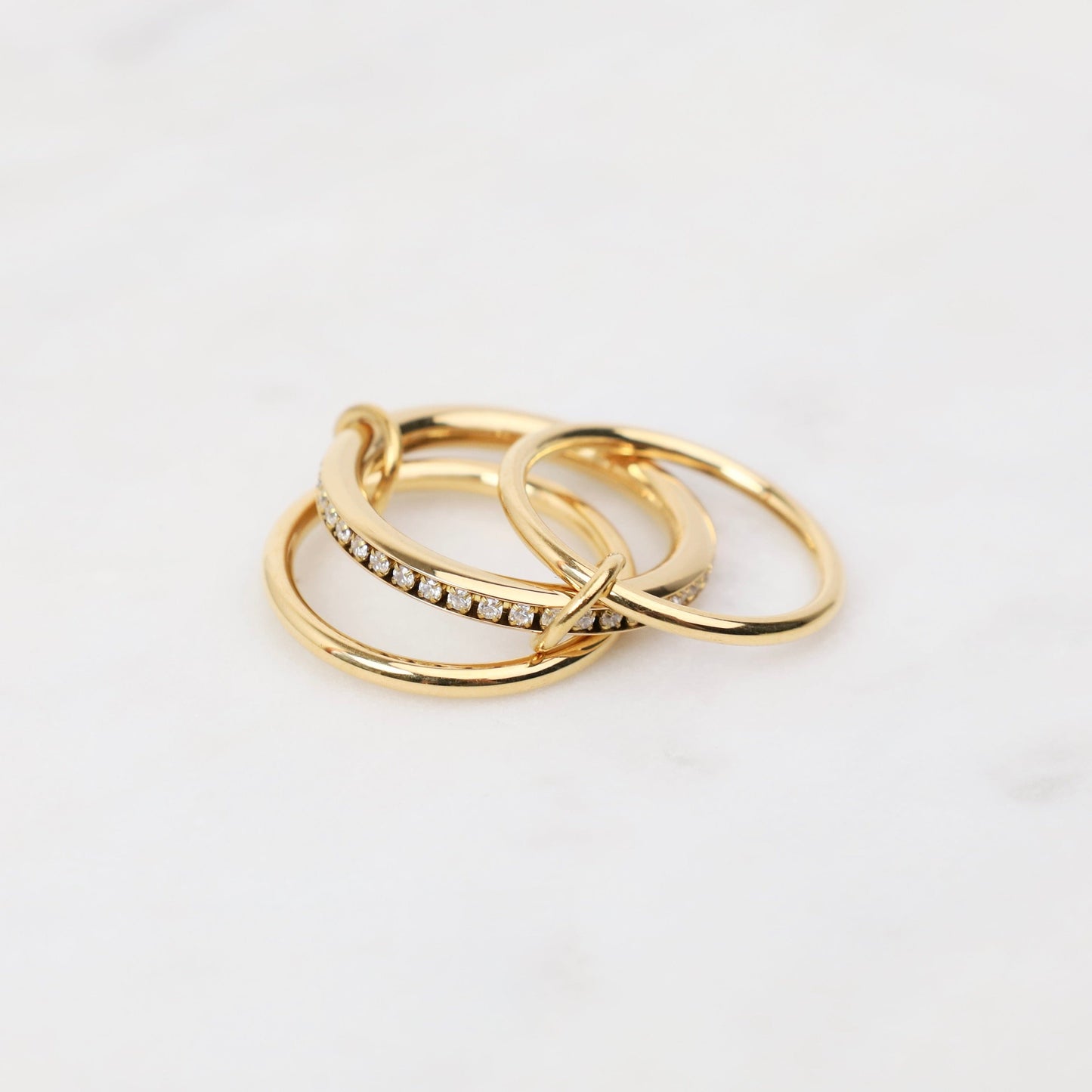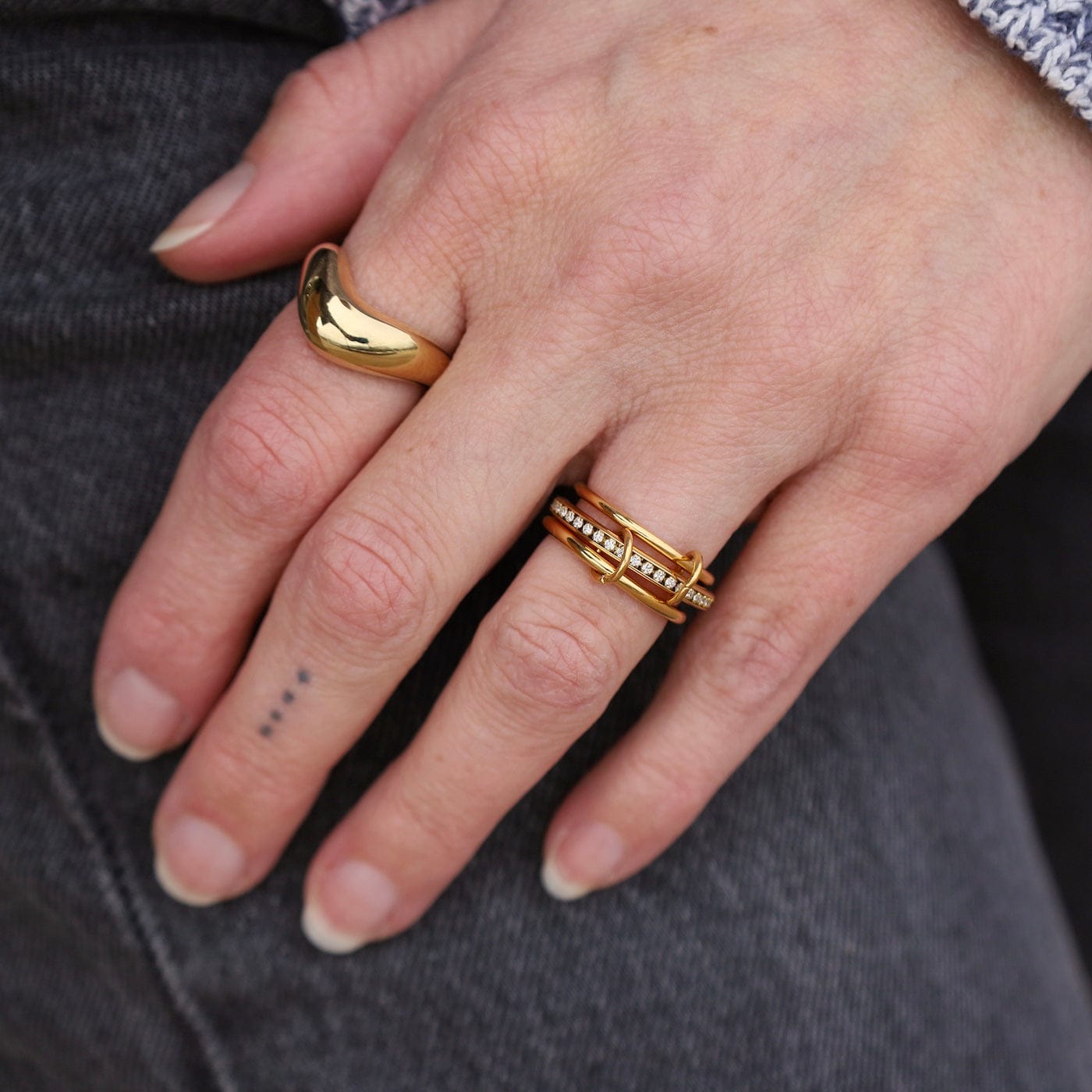 The Spin & Shine Ring features three connected bands—two sleek, polished bands paired with one dazzling cubic zirconia band that catches the light with every spin. Perfect for those who love a little movement and sparkle in their everyday style. By Isla Waterproof: Swim, sweat, shower, no problem! Wear it 24/7!