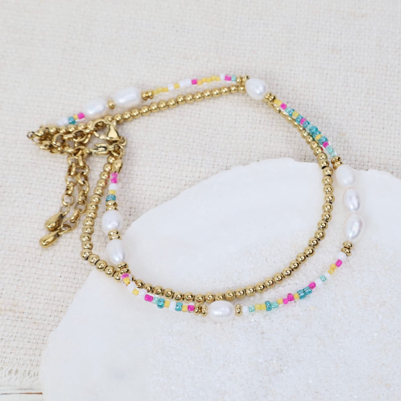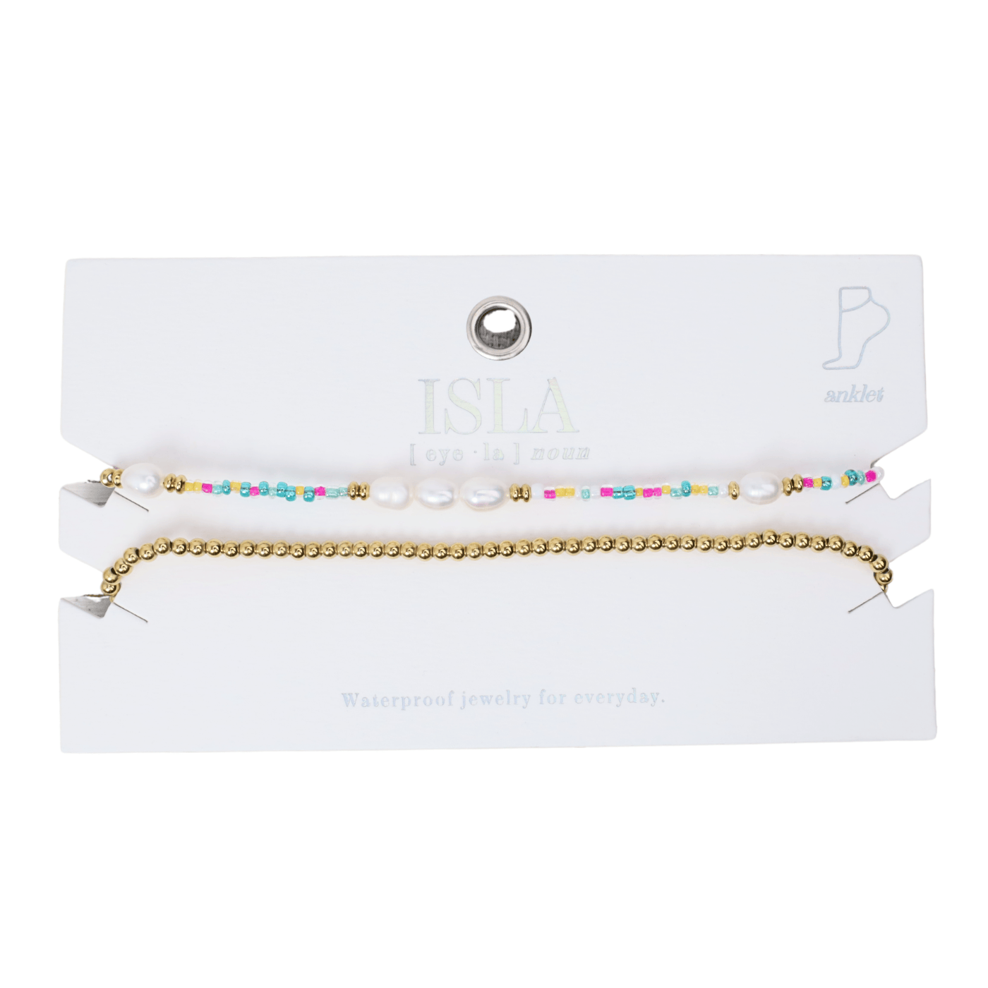 This fun set includes two separate anklets to stack or wear on their own. Bright beads, pearls, and a classic strand of gold ball beads give you plenty of options!
