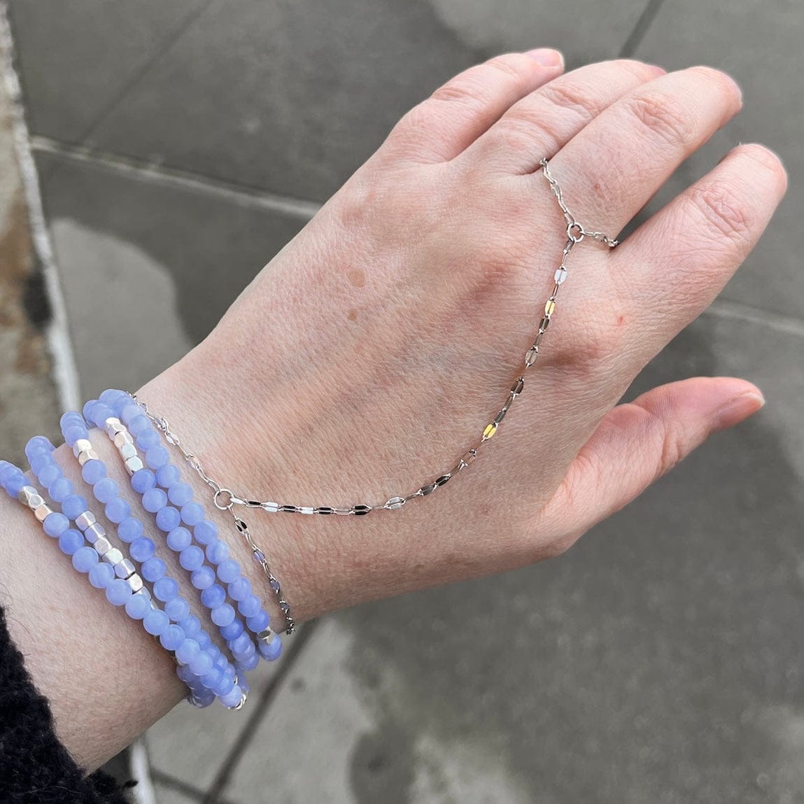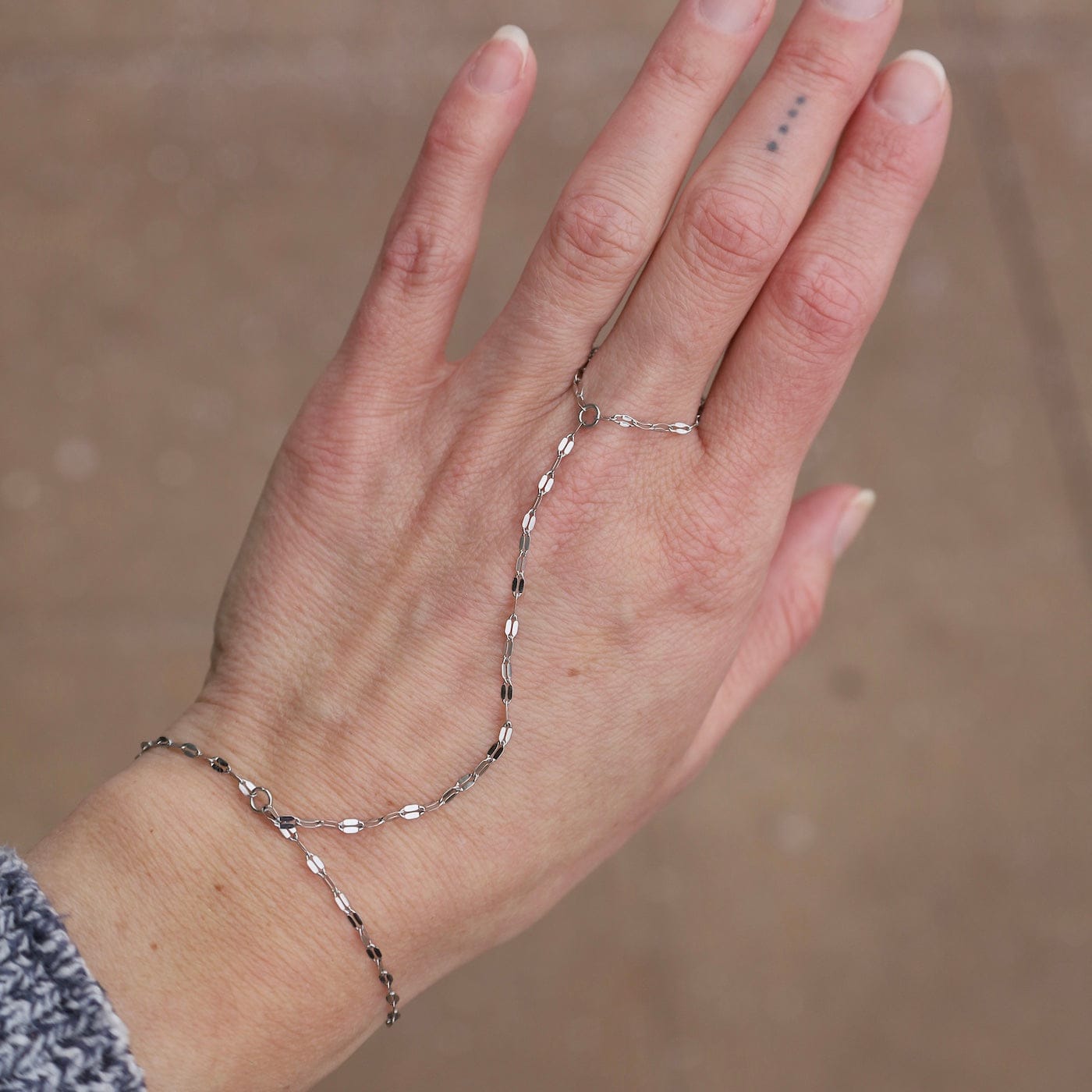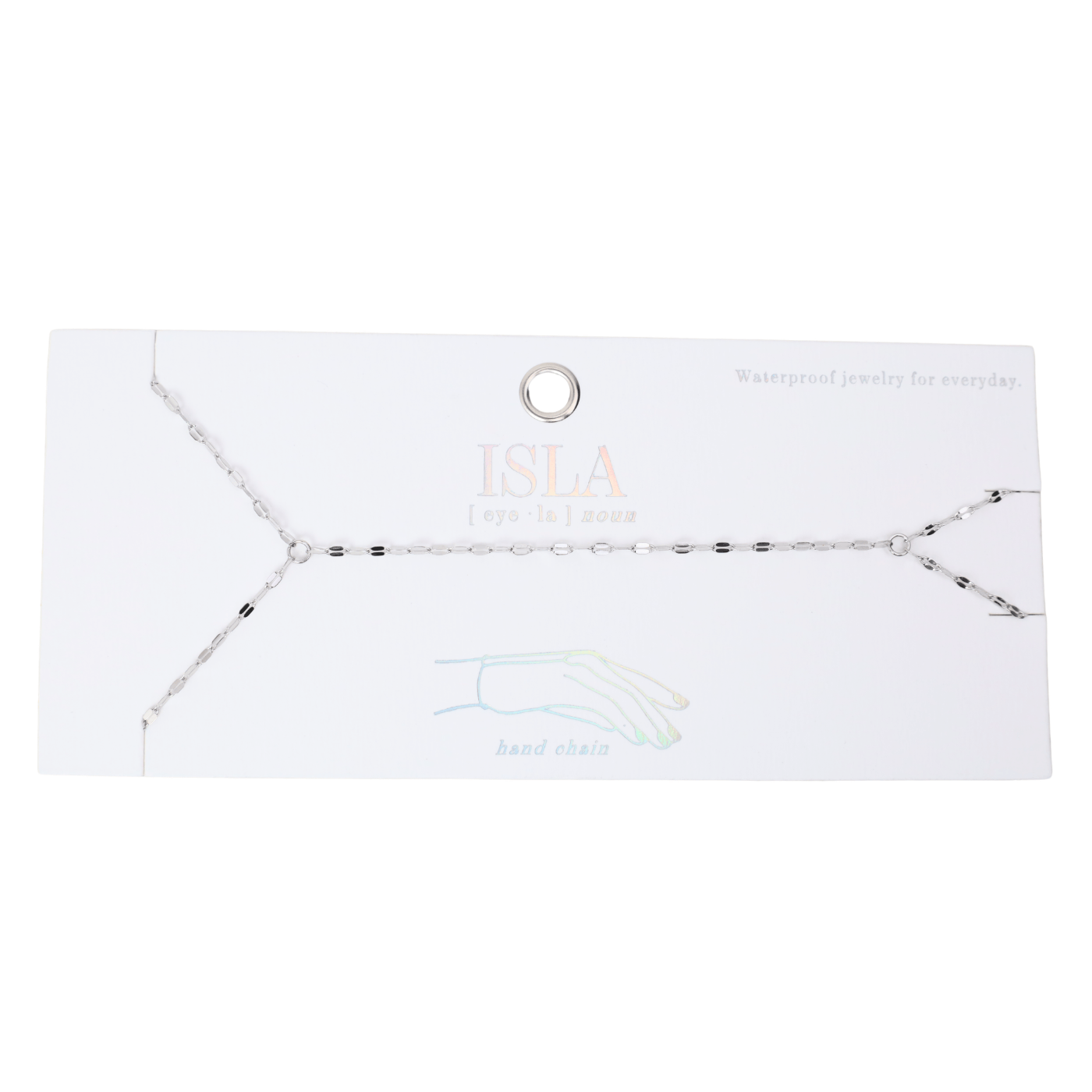 Add a dash of dazzle to your hand game with this mirror hand chain that's all about fun and flair. Lightweight, durable, and unapologetically bold. The Isla Collection offers waterproof jewelry for everyday. Swim, sweat, shower, no problem! Wear it 24/7! Modern classics to dress up or wear casually.