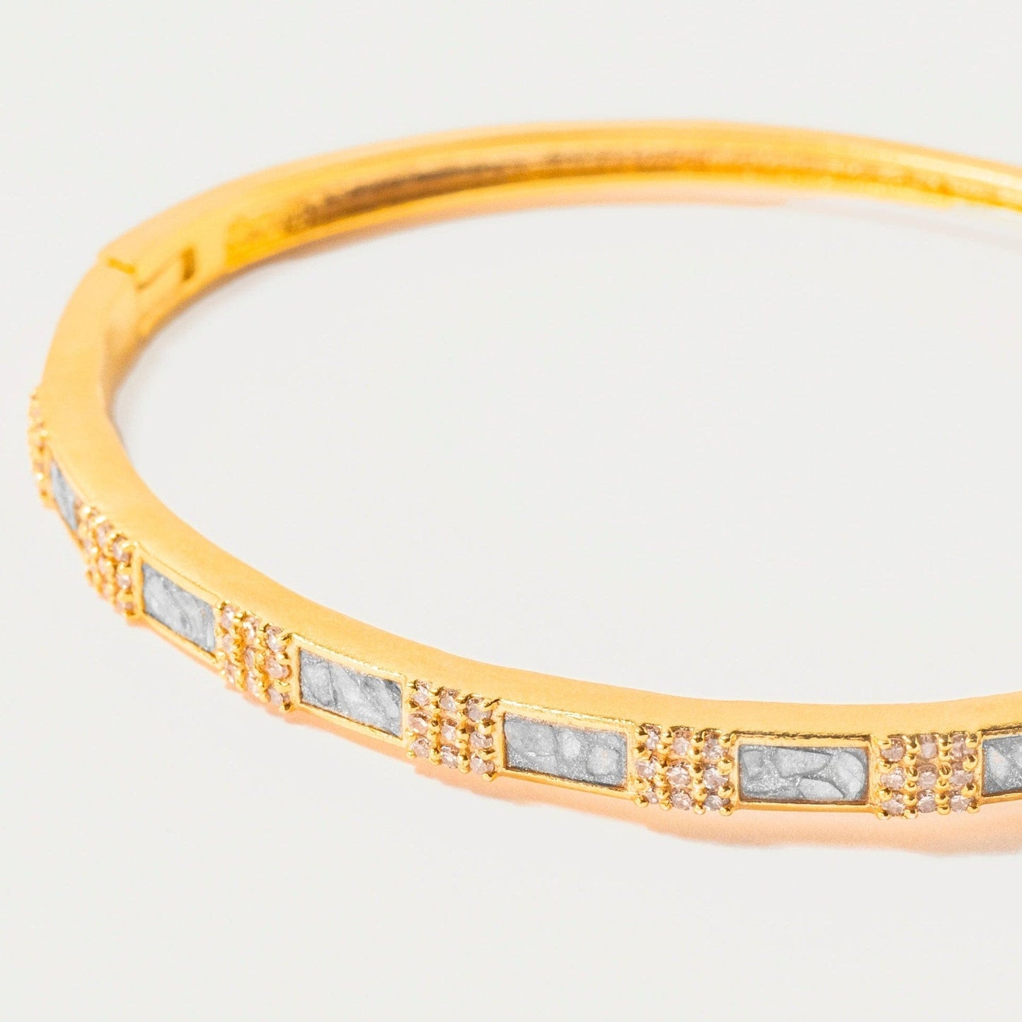 Timeless elegance meets modern sparkle in this beautifully detailed bangle. A rhythm of raw diamond slices alternates with champagne pavé, creating a refined, luminous pattern around the wrist. The warm gold setting adds richness and glow — the kind of piece that catches the eye effortlessly, day or night.