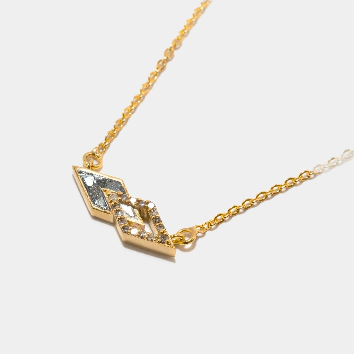 A modern balance of edge and elegance. This geometric pendant pairs raw sliced diamonds with champagne pavé, creating a striking play of texture and light. Elevated yet effortless, it's a piece that feels as good with silk as it does with denim—quiet strength, bold sparkle.