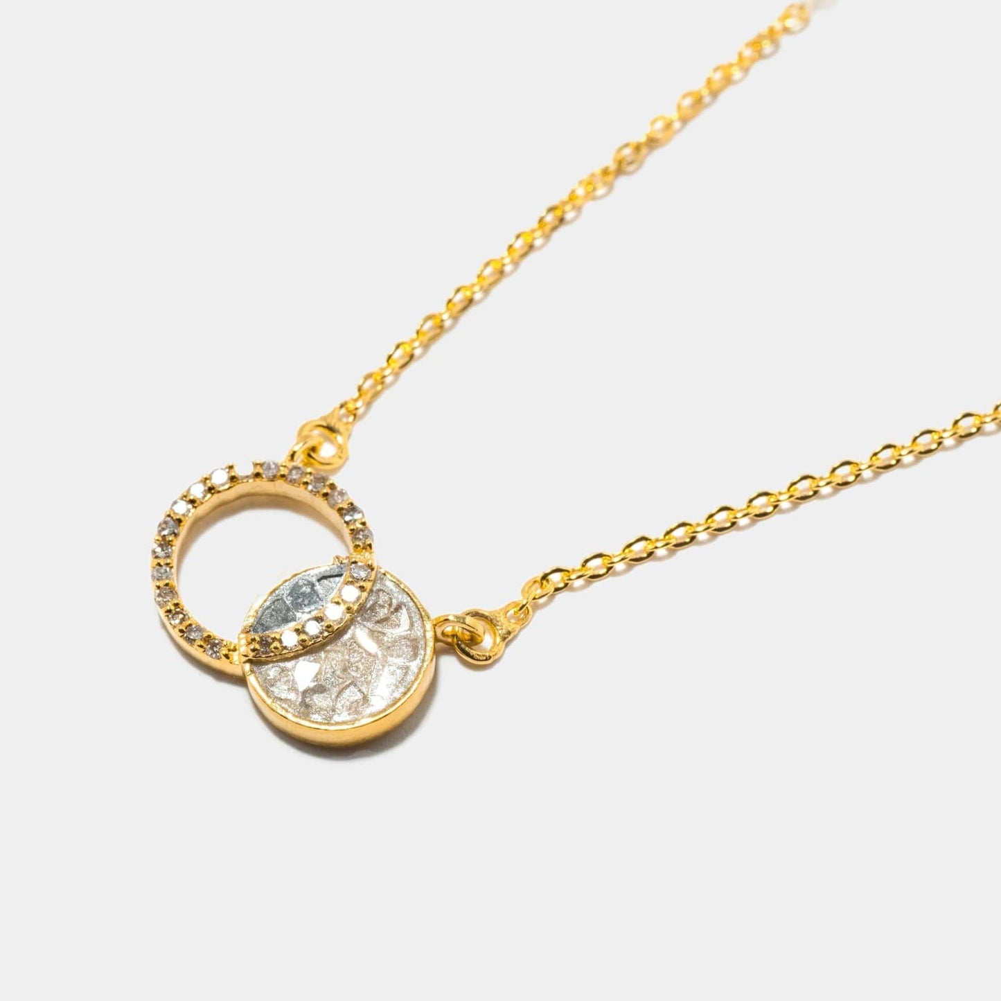 A poetic play on connection and time, this pendant features two intersecting circles — one shimmering with pavé, the other glowing with raw diamond slices in soft resin. The gentle overlap creates a subtle, symbolic moment of unity and light. Delicate, modern, and deeply meaningful, it layers effortlessly and shines on its own.