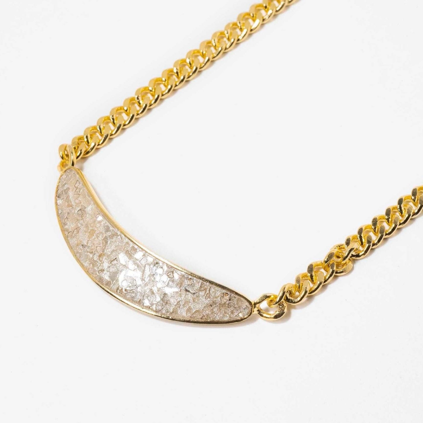 A clean, sculptural crescent meets bold gold in this striking statement piece. The Loha necklace pairs a sleek bed of raw sliced diamonds—subtly suspended in luminous white resin—with a substantial gold vermeil curb chain. Modern, confident, and quietly radiant, it’s the kind of piece you put on when you don’t need to say a word—your jewelry speaks for you.