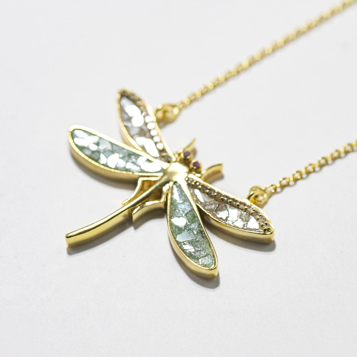 A symbol of transformation and lightness, this dragonfly pendant flutters with soft shimmer and joyful color. Raw diamonds sparkle in airy wings, while a touch of pink sapphire brings gentle radiance. Feminine, graceful, and full of meaning—an everyday reminder to follow your true path.