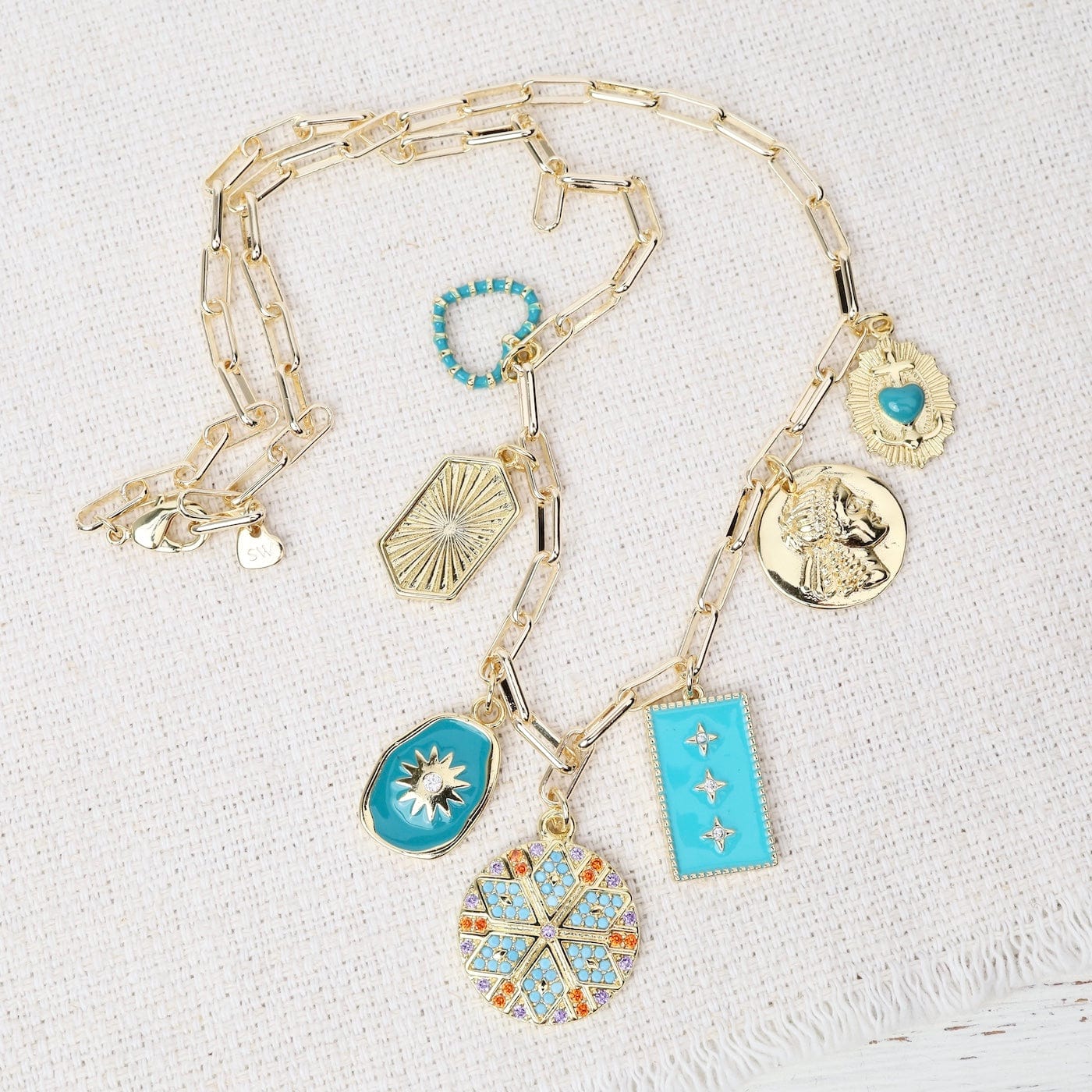 Bursting with color and personality, this statement necklace features a mix of teal enamel and gold-plated charms, each with its own distinctive design. The vibrant palette and playful details make it perfect for layering or wearing solo as a conversation piece.