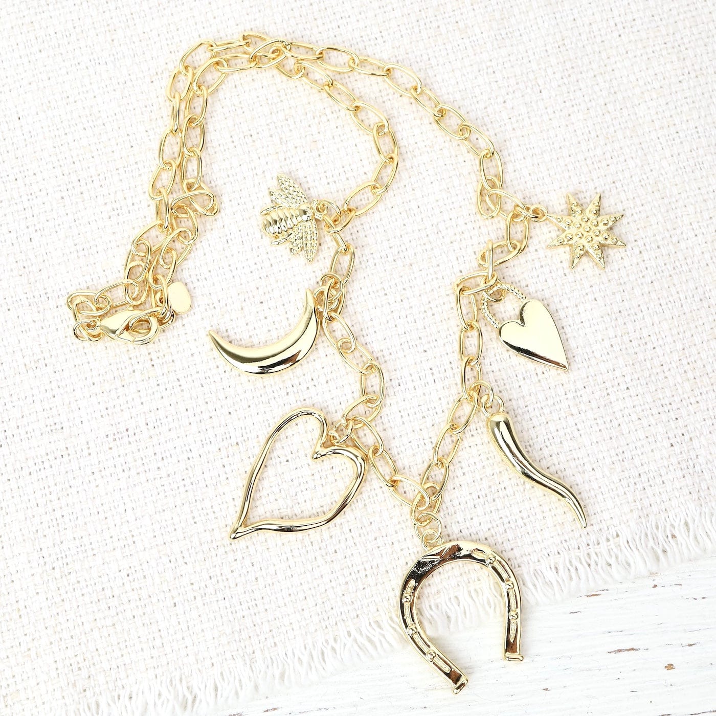 A golden collection of charms brings symbolic beauty and effortless shine to this statement necklace. Featuring a mix of celestial and lucky motifs—including a crescent moon, starburst, horseshoe, bee, and heart—each charm dangles from a polished gold-plated chain for a layered, collected-over-time feel. Perfect for adding a touch of warmth and whimsy to any look.