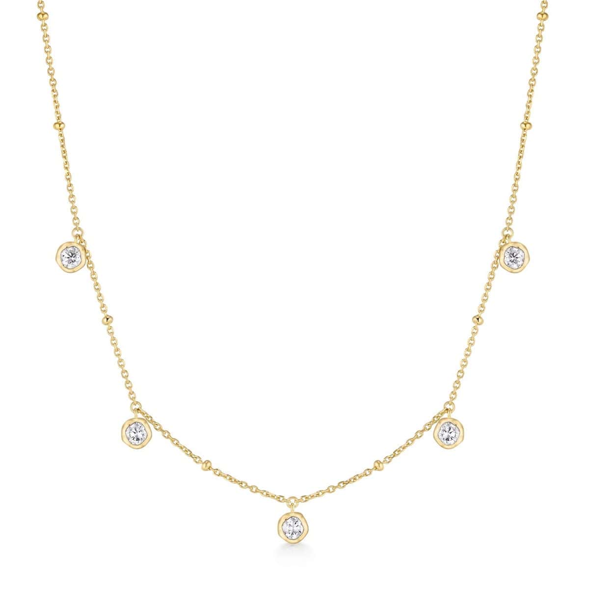 For the romantic soul who treasures life’s delicate moments. Molten bezel stations suspend luminous cubic zirconia droplets, each catching the light like captured dew. Gracefully refined and effortlessly wearable, it transforms the everyday into something ceremonial—beautiful worn alone or layered to express your own unique story.