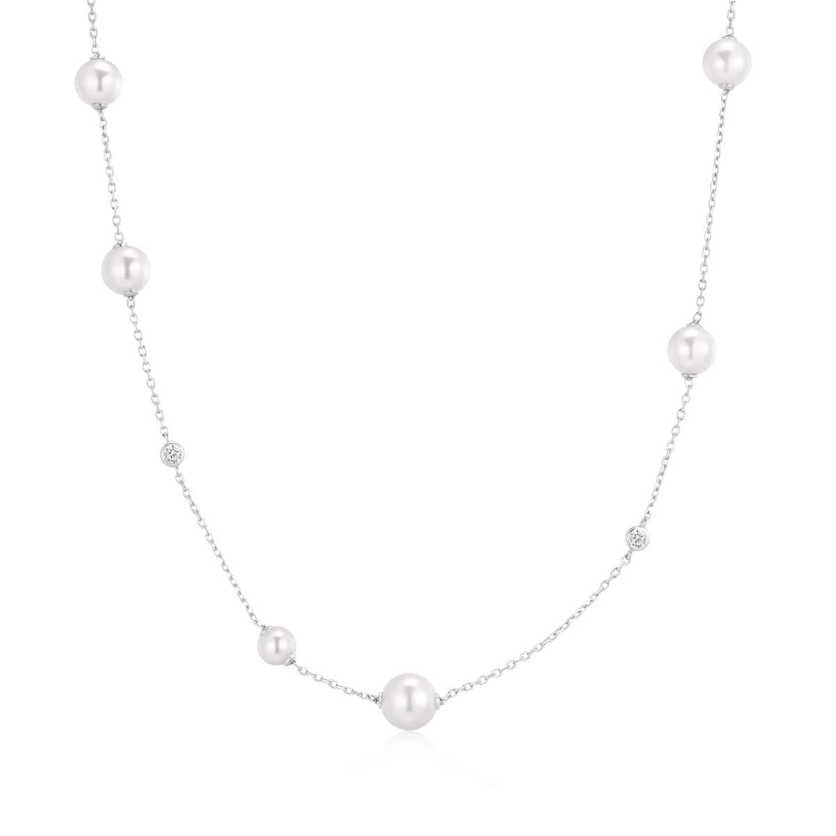 This romantic necklace features an artful arrangement of luminous shell pearls, each varying in size and set at deliberate intervals along a delicate chain. Subtly unconventional and thoughtfully composed, it offers a modern interpretation of classic elegance—perfect for those who appreciate refined style with a hint of individuality. Wear it alone to showcase its graceful rhythm, or layer with fine chains to create a look that feels effortlessly your own.