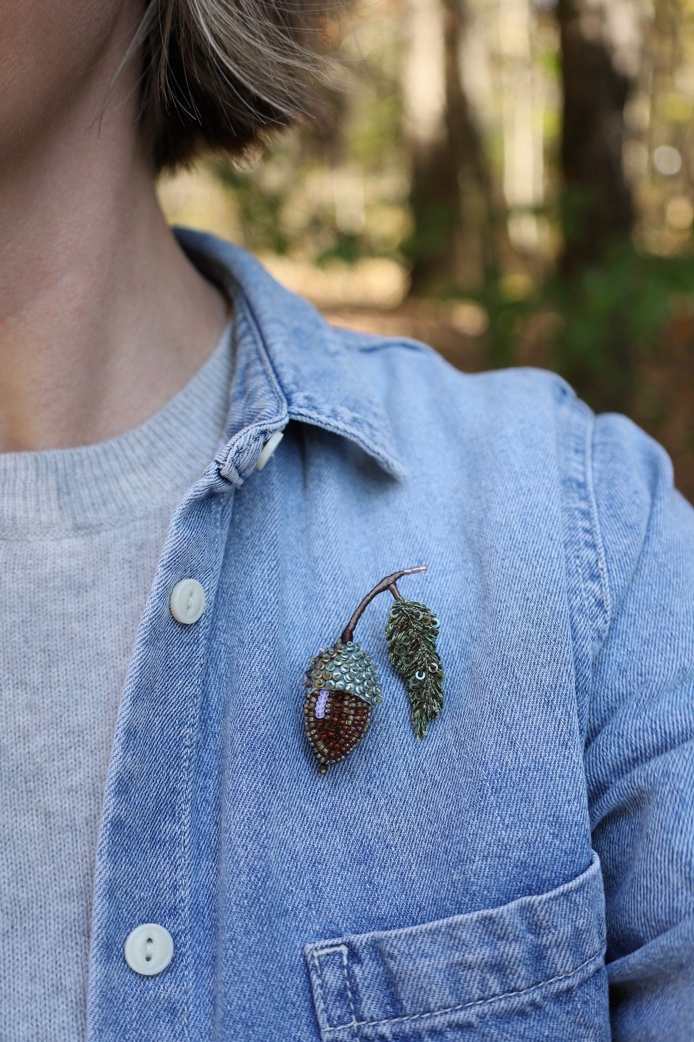 Symbolizing growth, potential, and resilience, the acorn reminds us that even the mightiest oak begins as a tiny seed. This intricately beaded brooch captures the natural charm of the acorn and its leafy stem — a wearable nod to nature’s quiet strength and enduring beauty.