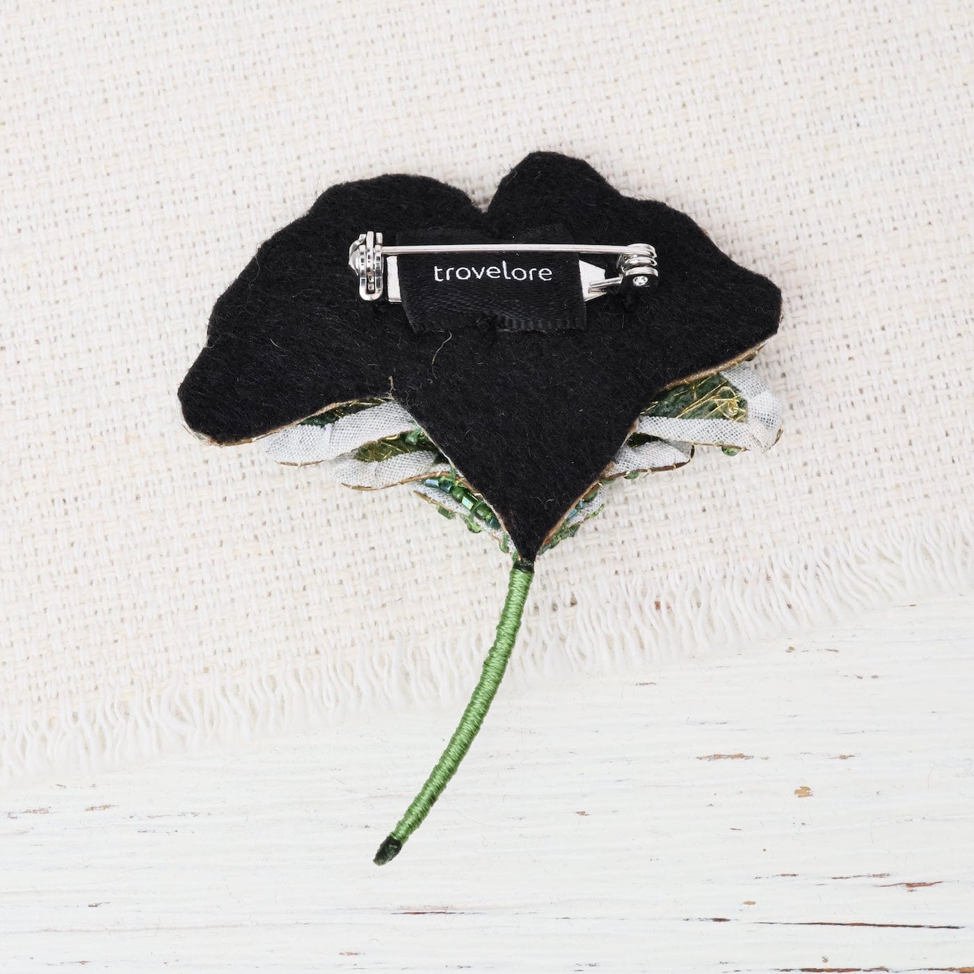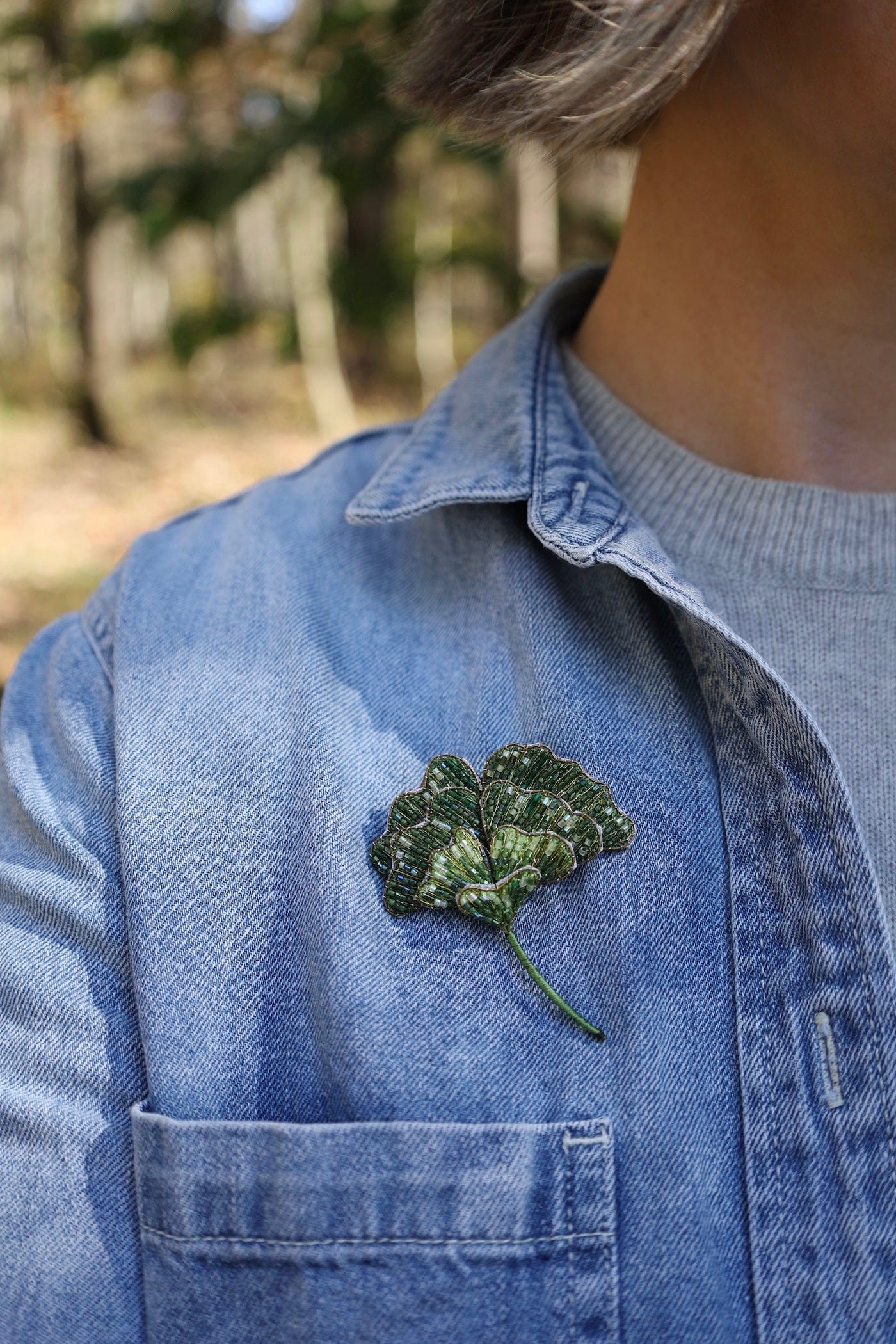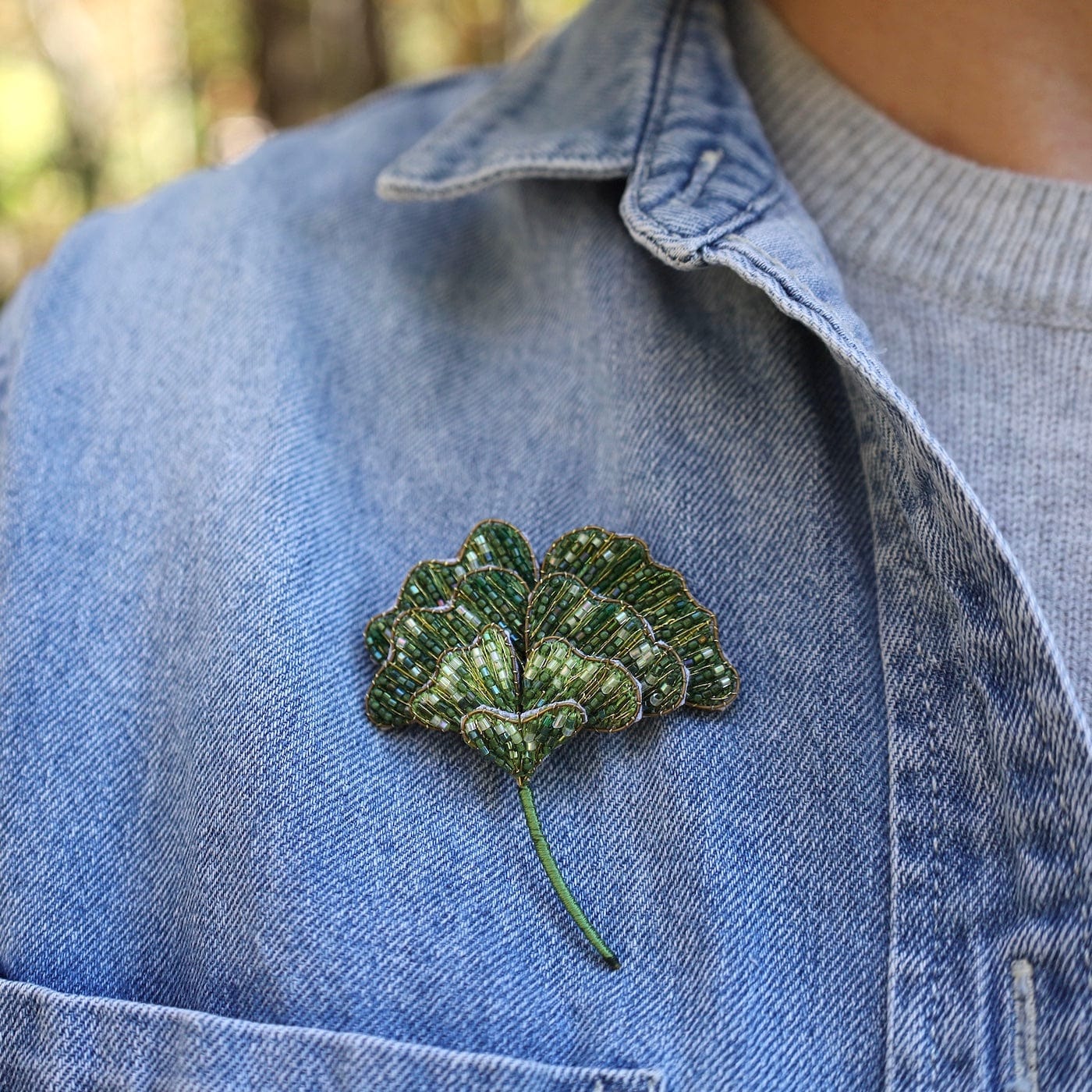 Inspired by the ancient Ginkgo biloba, a living fossil that has graced the earth for over 200 million years, this golden brooch celebrates timeless beauty and endurance. The hand-beaded fan-shaped leaf shimmers in warm gold tones, echoing the tree’s breathtaking autumn display when it releases all its leaves in a single, graceful fall.
