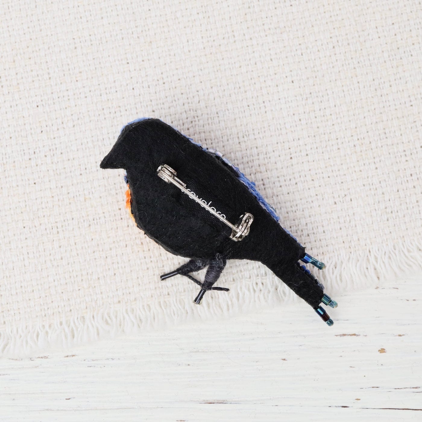 A symbol of happiness and renewal, the Eastern Bluebird comes to life in this intricately hand-beaded brooch. Brilliant blues and warm orange hues are delicately embroidered to capture the bird’s vibrant plumage and gentle charm — a wearable piece of nature’s beauty.